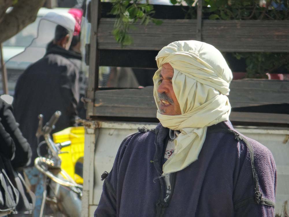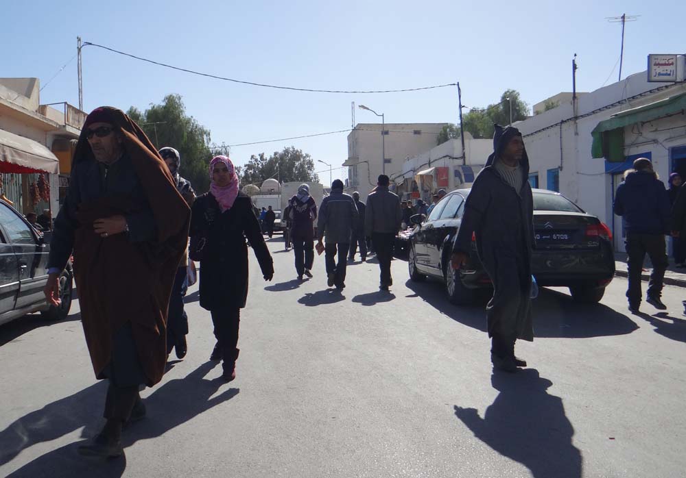 Saturday is souk day in Ben Guerdane, so we expected some degree of chaos. The town sprawls out for miles, large, decorated and arched villas at the outer edge with their own walled plots of dust, giving way to the usual thick array of blocky white buildings. A junction in the road with no apparent way through the jostling vehicles marked the edge of the souk. I closed my eyes, selected first gear and turned left. Everyone got out the way. A little way up the road we pulled over, some kids on a wall nearby staring straight at us, unnerving us as we walked off back towards the souk.