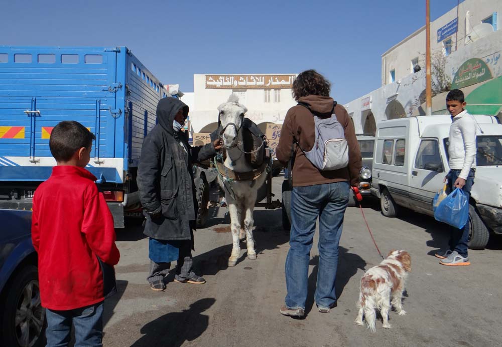 The market turned out to be much like any other we’ve been to, huge stacks of vegetables, Chinese plastic stuff, bundles of second hand clothes. A couple of stalls were selling Berber robes, but Ju’s decided it was Tataouine or nowhere to buy one, and we moved on. As usual, Charlie drew a pretty much steady stream of interest, ranging from a ‘I’m getting no closer’ stare to several serious offers to buy him – how much for Rex? I guess we were in a market, and we were very careful not to name any numbers, just in case we accidentally flogged our wee beasty. A nipper in a red top latched on to us, or more accurately to our mutt, and wouldn’t leave.