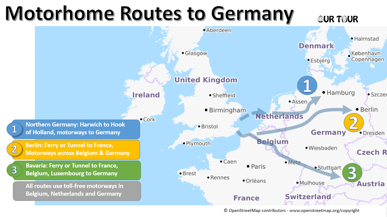 Taking your own motorhome to Germany is pretty straightforward. Ferries from the UK will get you over to France, Belgium or the Netherlands, from where you can take toll-free motorways into Germany. Of course, Germany is a rather large country, so your route will probably vary depending on which part(s) you want to visit. This interactive Department for Transport map shows the various ferry routes available, and the image below shows some example driving routes into Germany.