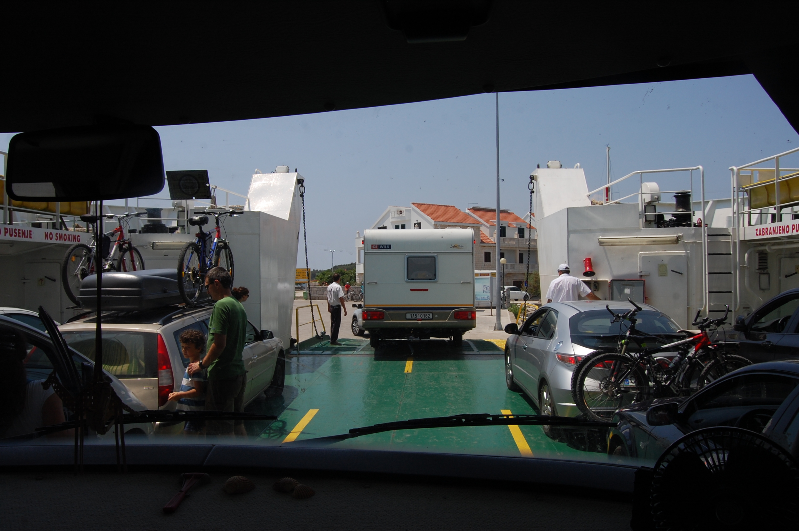 Eager to get away Jay took Charlie for a walk to count up the queue of cars. The ferry holds 28 so we’d never make it onto the next one, which was performing an impressive handbrake turn very, very close to the locals on the beach. Dave dutifully shuffled forward as the snaking queue made its way onto the ferry, our only hope was that we would end up parked somewhere in the shade as it was now noon and the next ferry wasn’t due until 1.45.