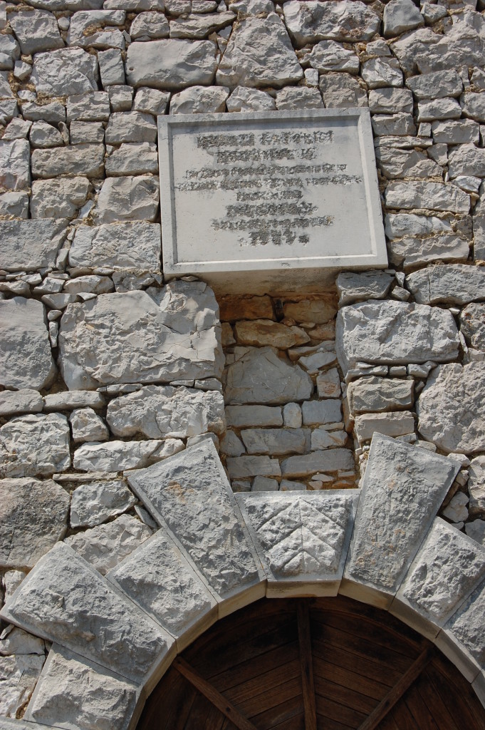 We crawled our way along past lavender fields surrounded by old crumbling walls, olive trees and the odd vineyard. We passed the odd building, included a church where someone had hacked away the inscription above its door. After about 50km we reached ‘civilisation’ – a road wide enough for Dave to keep to his side, smooth tarmac and some houses.