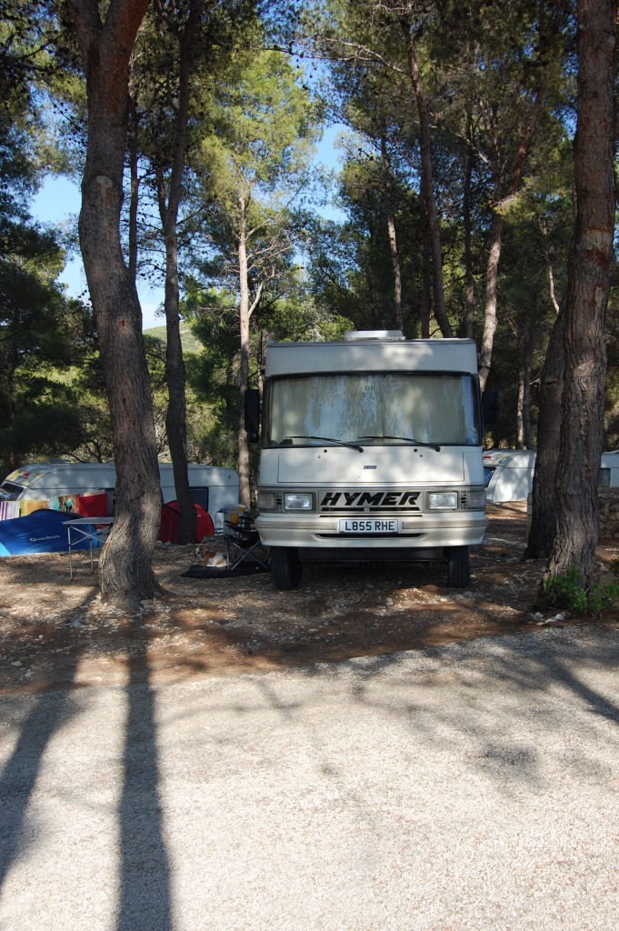 Dave the motorhome is sheltering under the shade of pine trees at Hvar Island, Croatia (N43.19087 E16.43060).