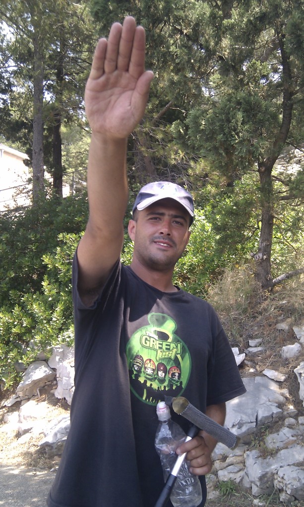 Before Jay had chance to put on the handbrake a man jumped up and squirted water onto Dave’s windscreen then started to clean it – badly. Maybe he’d been abroad and see it being done at traffic lights, either way we were reluctant to pay up so Jay started to quiz him instead. All along our journey through Croatia we’ve seen graffiti saying 1950 but didn’t know what it meant. Windscreen man explained it was the year the Hajduk Split supporters club – Torcida – was formed. Showing Jay the clubs crest tattooed on his arm he went on to tell us we must go to a match, then for some reason gave Jay a Nazi style salute so he would know where it came from??!!