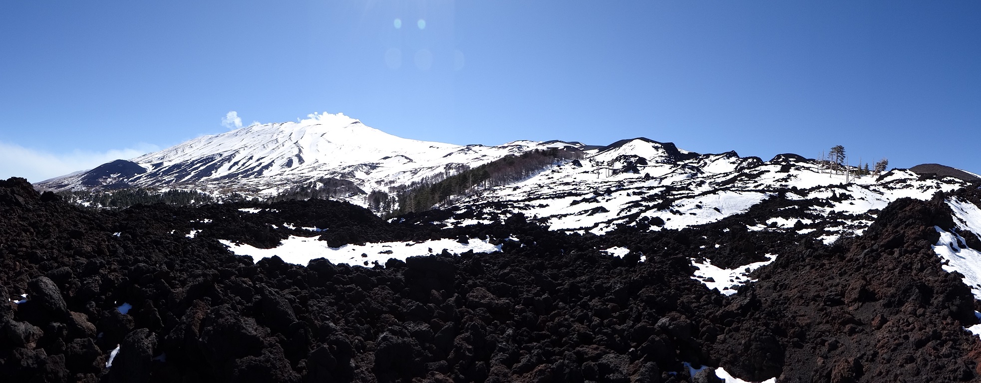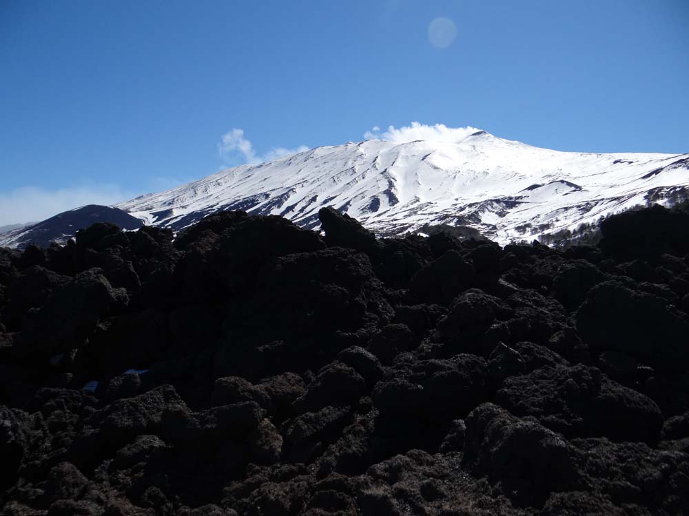 Etna has a number of craters. The one smoking which we can see from here isn’t the one currently exploding every few days, that’s on the other side. We’re about 8km away from the action, far enough to be safe, we think.