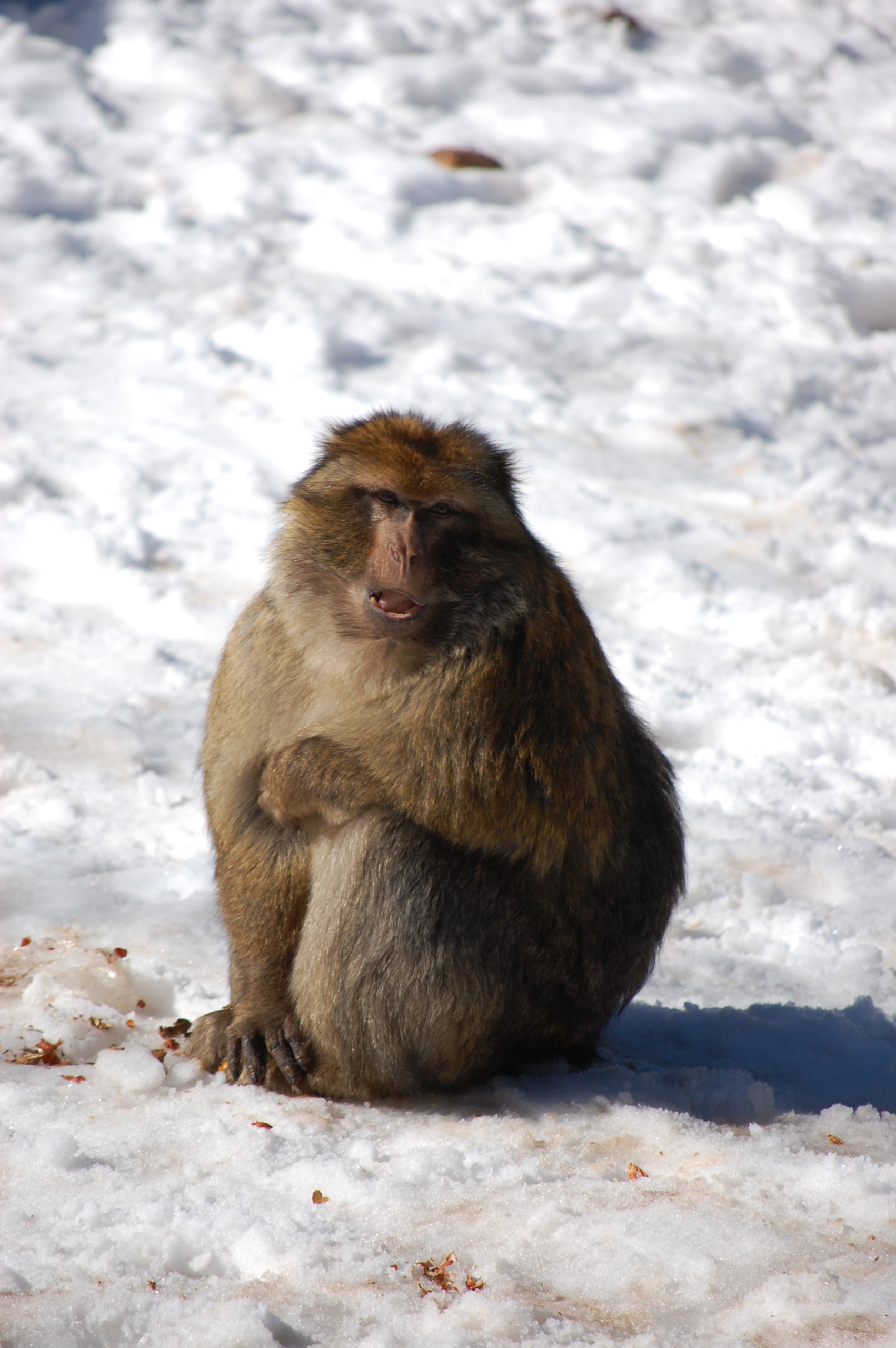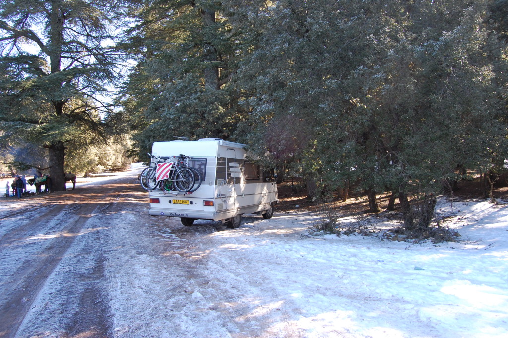 We paid our 80Dh (about £6.50) and set off in search of Barbary Apes in the cedar forest nearby. We drove along until it turned into a winter wonderland scene with ice and snow on the road. Luckily there were a group of lads nearby with horses and camels (like you do) so J nipped and asked the one who was donning his high visibility jacket (a sign of authority around here – 5Dh and he was VERY happy protecting our motorhome) where the apes were. The were just up the road, so J nipped over the sheet ice on his bike to check it out. Soon he was back (and his back was covered in mud) saying he’d seen an ape. So I grabbed the camera and off we went.
