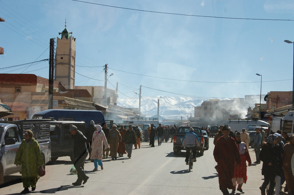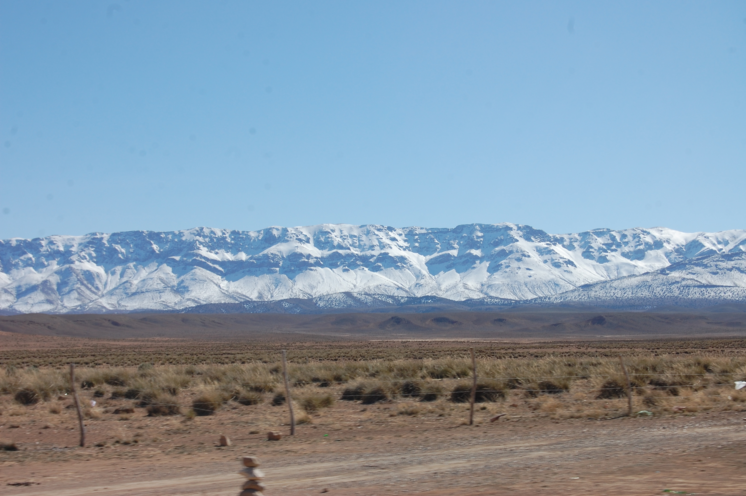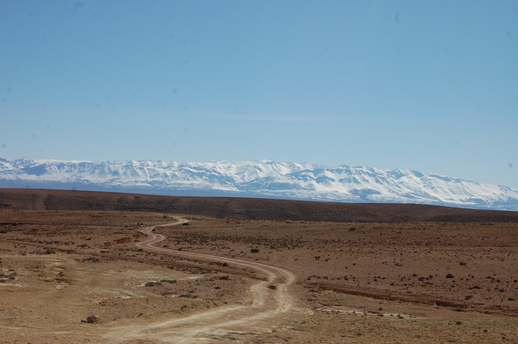 As we started back down the other side of the mountains, the snow gave way to a huge open plain which looked almost lunar – if the moon was red – and on the other side of this plain sat the snow covered High Atlas Mountains. Very much Alpine looking and our challenge for tomorrow. On this open plain people still grazed their livestock, although I don’t know what they were actually eating. We saw shepherds with flocks of sheep and a few hopping donkeys as their front feet tied together to stop them from wandering off. What we really didn’t want to see was a dog eating a dead donkey, but you know how it is when sometimes you’re just too slow to turn away and the image is there for life.