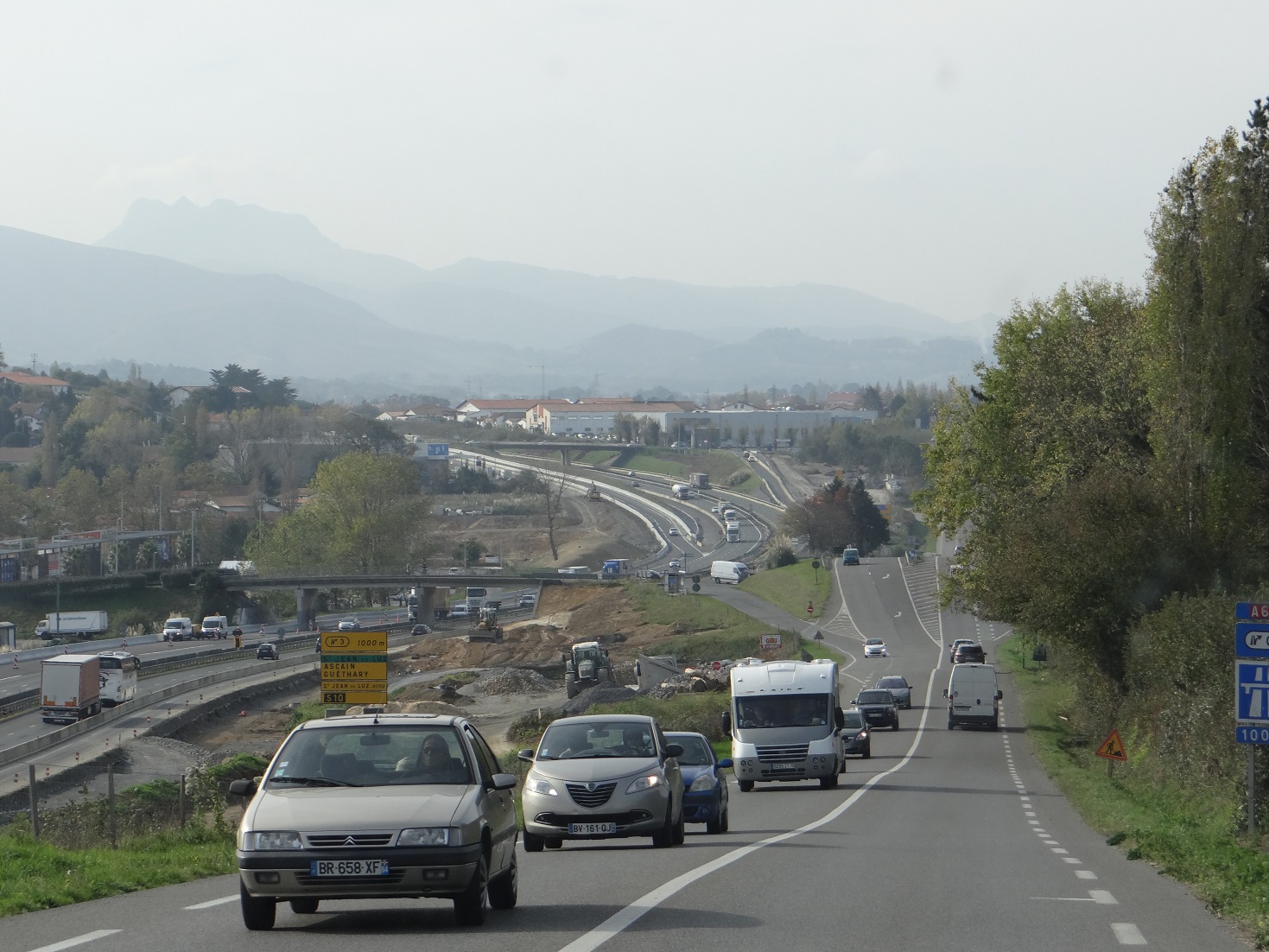 Bayonne, Barritz, Anglet, St-Jean-de-Luz, all merged. Joining the roundabout dots we eventually flowed out alongside the toll road for a few km, speeding up to an entire 50mph before the road gently lifted upwards and rolled away downwards into Spain. We missed the border, although somehow became aware we’d crossed into a new country. It could have been the road signs, as the numbering convention is different here, dunno. I’d already made sure the backs of my crocs were down behind my ankles, I have a feeling wearing them without the back strap in place would be illegal here?