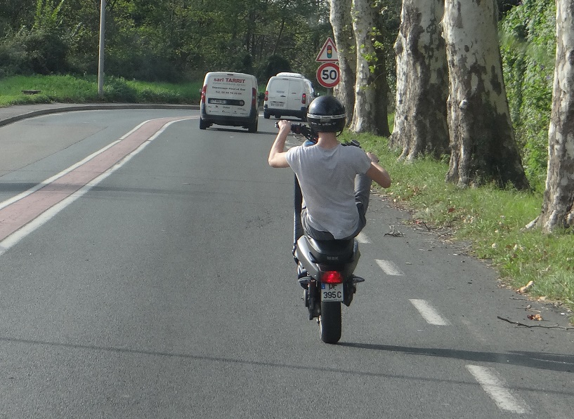 Having said that, once I’d woken up (after the best part of a bottle of rioja), a distant memory came to the fore, a memory of a bit of a crappy drive to be faced down to get us here. The corner of the Bay of Biscay, where Spain and France meet, is hemmed in by the foothills of the Pyrenees. The roads are edged out towards the coast, traffic between the two countries is funnelled down and seems to speed up accordingly. Taking the fast-flowing but toll motorway would probably have been a good idea, but Mr Tight had other ideas. I opted to take the back roads the same as last time, which I half-regret again like last time, since they’re a steady hassle of endless 800m-separated roundabouts, traffic-in-a-HURRY, and weird-ass indecipherable splayed-out junctions. I have an idea sometimes that driving a motorhome is akin to riding a lumbering elephant, while being harassed by nimble hyenas. Once the lunging, cackling cars and motorbikes have finally made it past you, I’ve noticed they start to nip at each other.