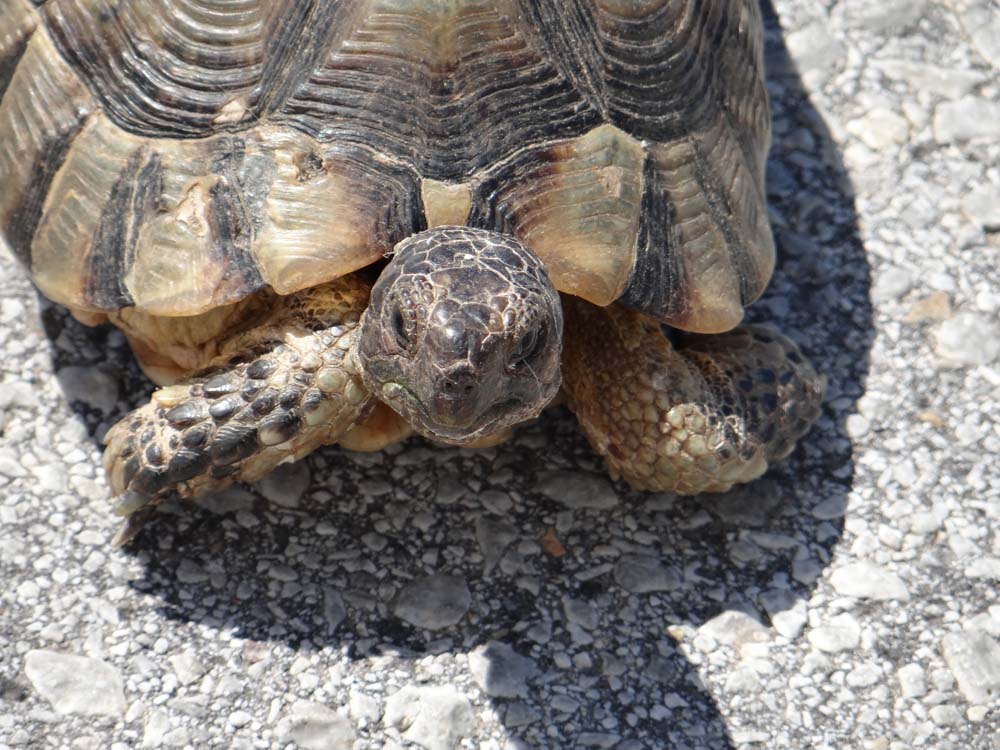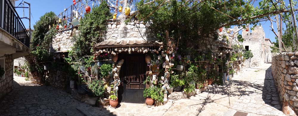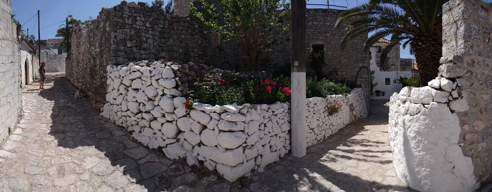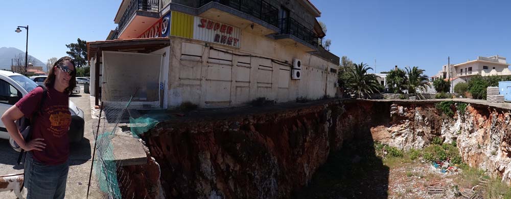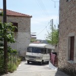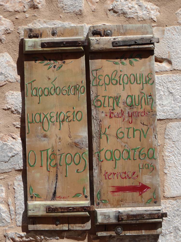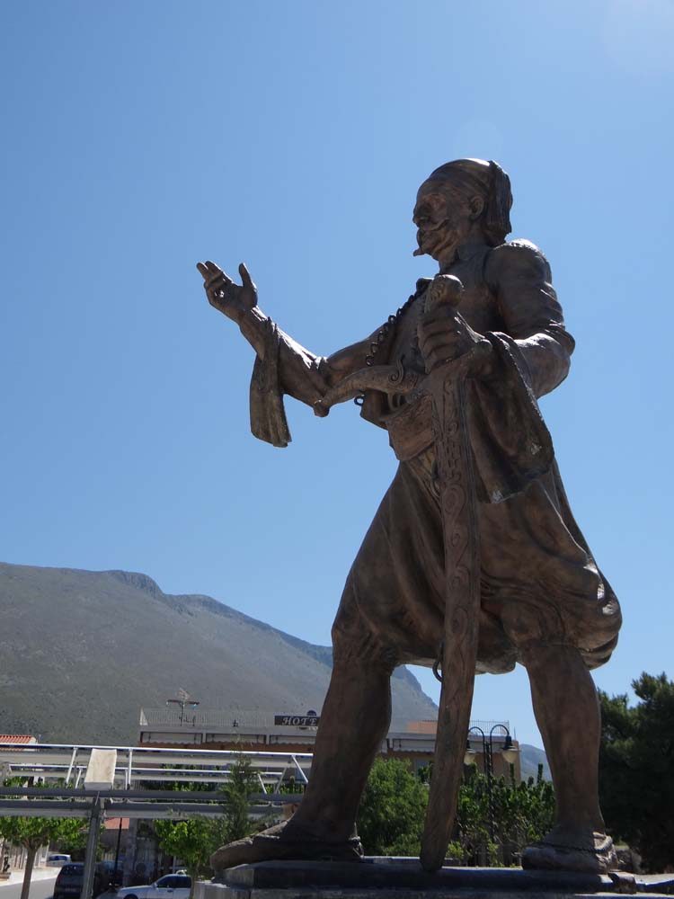 Ten or twenty minutes of Dave pulling us up the side of the hill and around over the top brought us to Areopolis. The Rough Guide described the place as ‘austere’ and we’d both expected that meant ‘dead’. Following signs for free parking we pulled in next to a college, kids and teenagers slouched about, or kicked a football, dressed much the same as those anywhere but with far better tans! Their shouts and laughter set the tone for the place, although quiet, it was most certainly alive. Yesterday our laptop decided to eat our SD card, only letting go over the thing when challenged by tweezers, yanking and a foul word or two. An unexpected bit of plastic came with it, rendering it a bit useless. A few days back the Micro SD card in our phone died too as I faffed about trying to download a decent map of Greece. Would these things be available here, on the edge of Europe? Ah, yes. Ju spotted some stencilled lettering, in Greek, but which still shouted to her ‘tech geeks live within’. They surely did. Walking with Charlie four guys turned to look at us. Within a few minutes one was giving Charlie a massage, explaining how he hated having to work away in Athens for 3 weeks out of 4, and how he was on his 3rd Boxer dog, the other two taken by cancer ‘like losing a child’. When I asked how the chap helping me was he said ‘on the last day of the month, if we have some bread, then it will be a good day’. He almost laughed it out – perhaps they were living hand to mouth but it didn’t seem to bother them much.