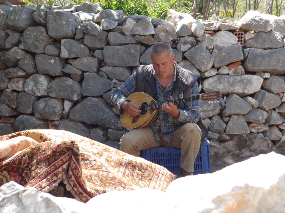 Tech procured, we walked the town, a place of stone and sunshine, funny little corners to draw you in, sights and sounds everywhere. In one spot it would feel aged, a little lost, with rusting swings and a slide-less slide. In others alive and bright, the square felt new, Easter decorations were starting to appear and a few folks sat in the shade, some watching us, almost all saying hello as we passed. One fella sat in his garden playing a guitar-like instrument as I stood and recorded him, completely non-plussed, have a listen if you like: