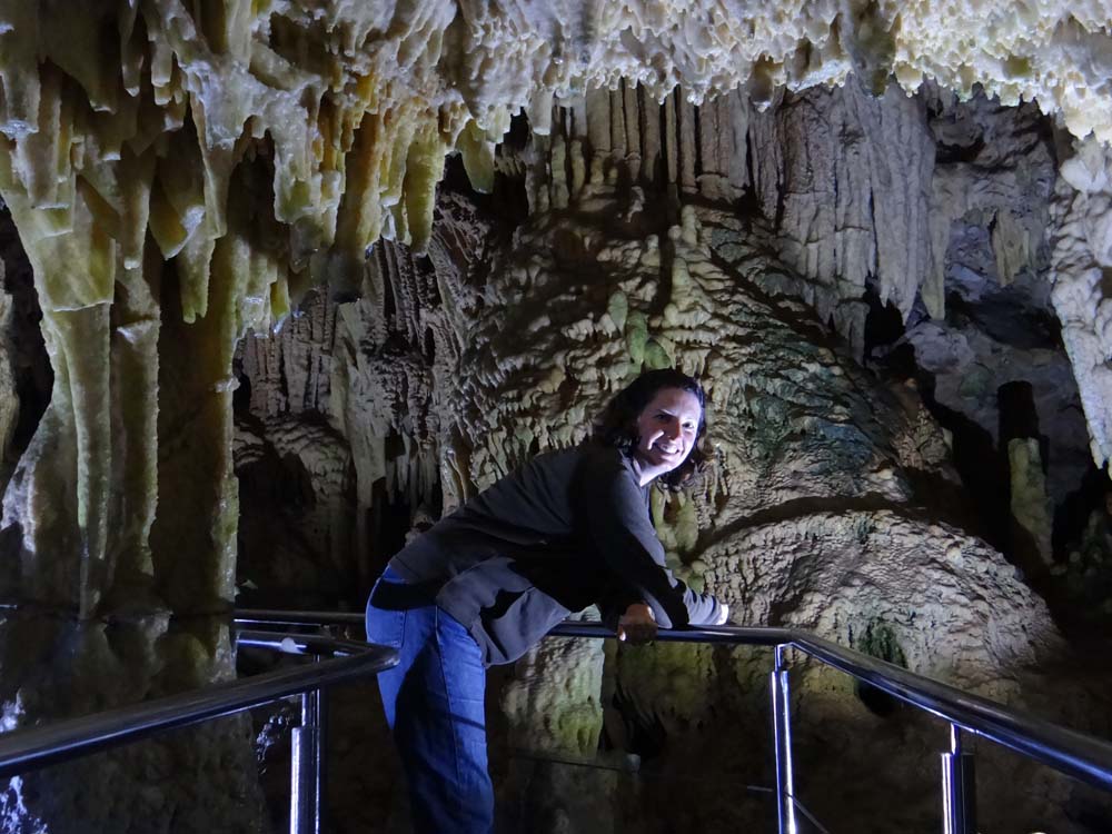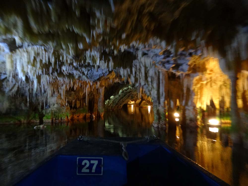 Mission accomplished, we set off again. Tech man had told us we must visit the Diros Caves, and somewhere else, which he scrawled in Greek on the plastic bag with our bits and bobs in, and which I’m now struggling to decipher. The Caves are, apparently, the biggest tourist draw in the Deep Mani. And that means one thing: coach-capable roads! If a coach can get there so can we, easily, so we followed the signs along a descent beside yet another stunning cove and up to the gates, Ju grabbing a couple of €12 tickets. Inside the place couldn’t be more different to the production line Postojna Caves in Slovenia we visited last year. The whole experience was, as we’d say in the eighties, ace.