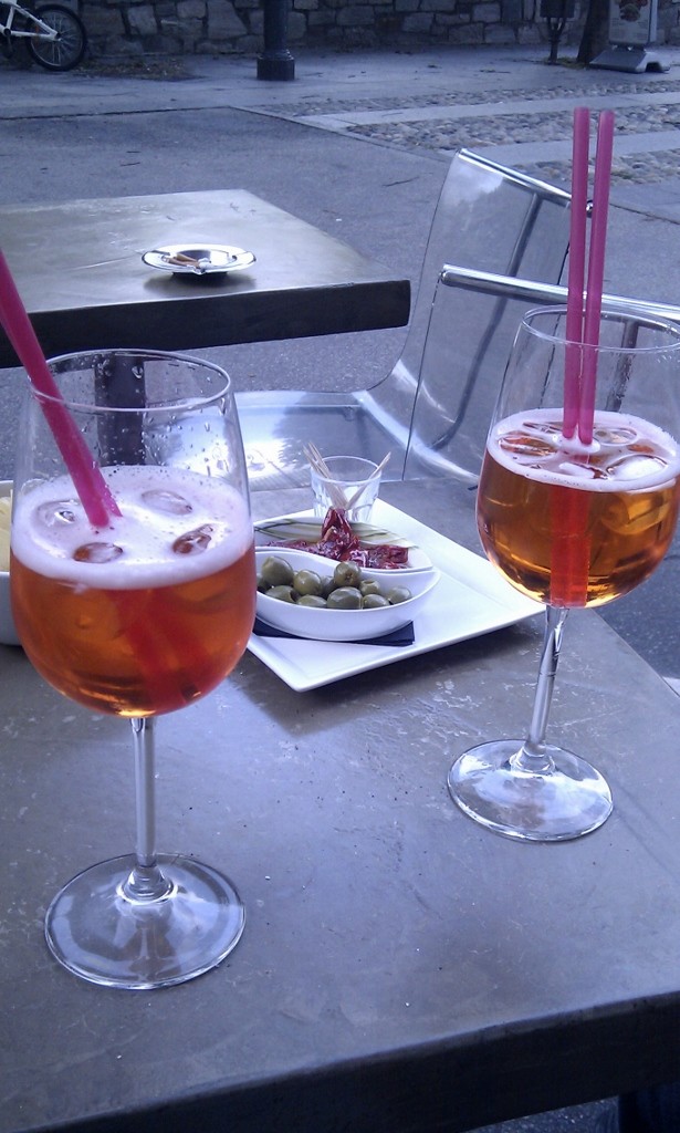We nip into a cafe for a couple of the drinks we saw everyone quaffing earlier, big wine glasses filled with an orange liquid that looked like Irn Brew, Jay asks for a drink while I find the word orange in the phrase book – the waitress gets what we mean and soon she arrives with the drinks, accompanied by crisps, olives and sun-dried tomatoes to nibble on, so the €8 cost doesn’t seen so bad.