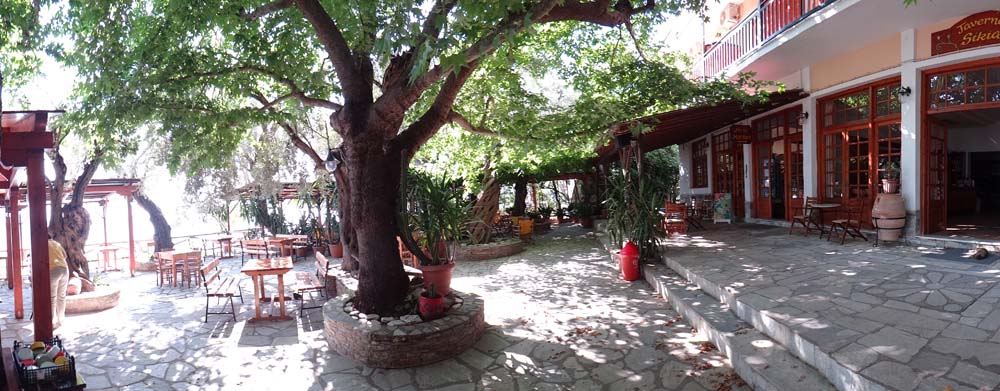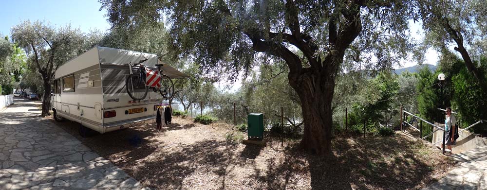 Dave the motorhome’s feeling the occasional drop of an early green olive rolling off on his roof and awning, sat still in the sun at Camping Sikia, Pelion, Greece (N39.309174 E23.109355). The sun’s just about to dip down behind the hill to my left, plummeting us into the mid 20 degrees C. No need to get out a jumper!