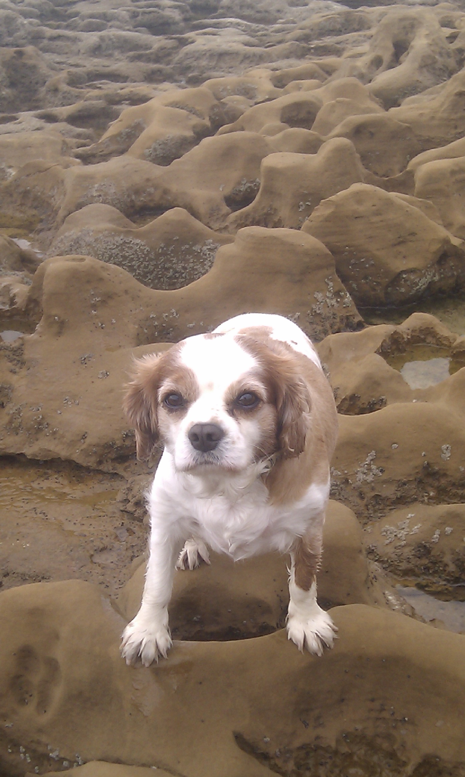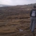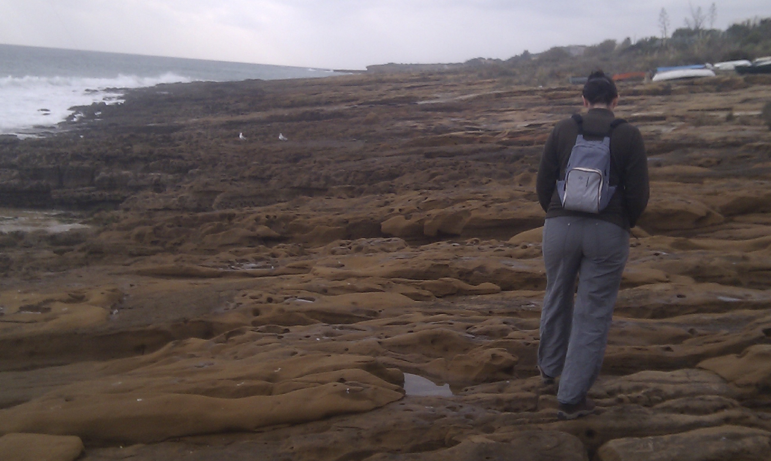 - Ju negotiates what looks like successive flows of lava, being eroded by the sea at Luz, Portugal