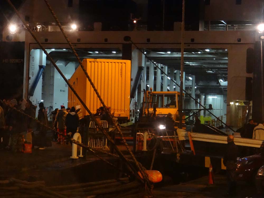The GNV ferry docked about the time it should have left and spent the next 3 or 4 hours disgorging lorries, the usual massively overloaded Tunisian cars returning home and a few scattered passengers. Time dragged on, not helped by a second ferry docking at the same floating metal platform ours was at, and the dock crews engaging in some sort of Madame Butterfly action, shouting, waving, driving little lorry fronts about at breakneck speed. People arrived on foot to get on the GNV, only for an Italian staff member to go into arm hysterics, flailing about to get them off the on-ramp. We started to wonder how many people must get killed while trying to get on or off a ferry in Tunis, there being zero separation between soft squidgy humans and thundering trucks. Finally one of the unloading trucks did something wrong and half-mangled the machinery it was off loading, accompanied by a collective shout from the load of blokes stood about on the platform. Amidst all of this black-clad ninja Italian guards waved torches under boarding vehicles, checking for anyone trying to make the same escape to another continent as us.