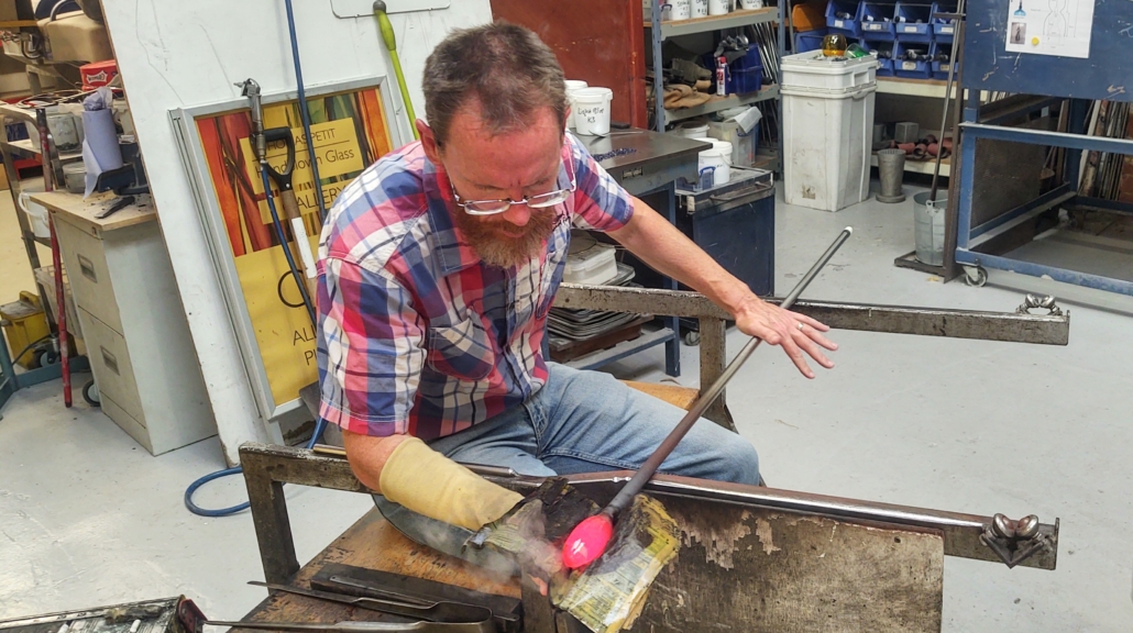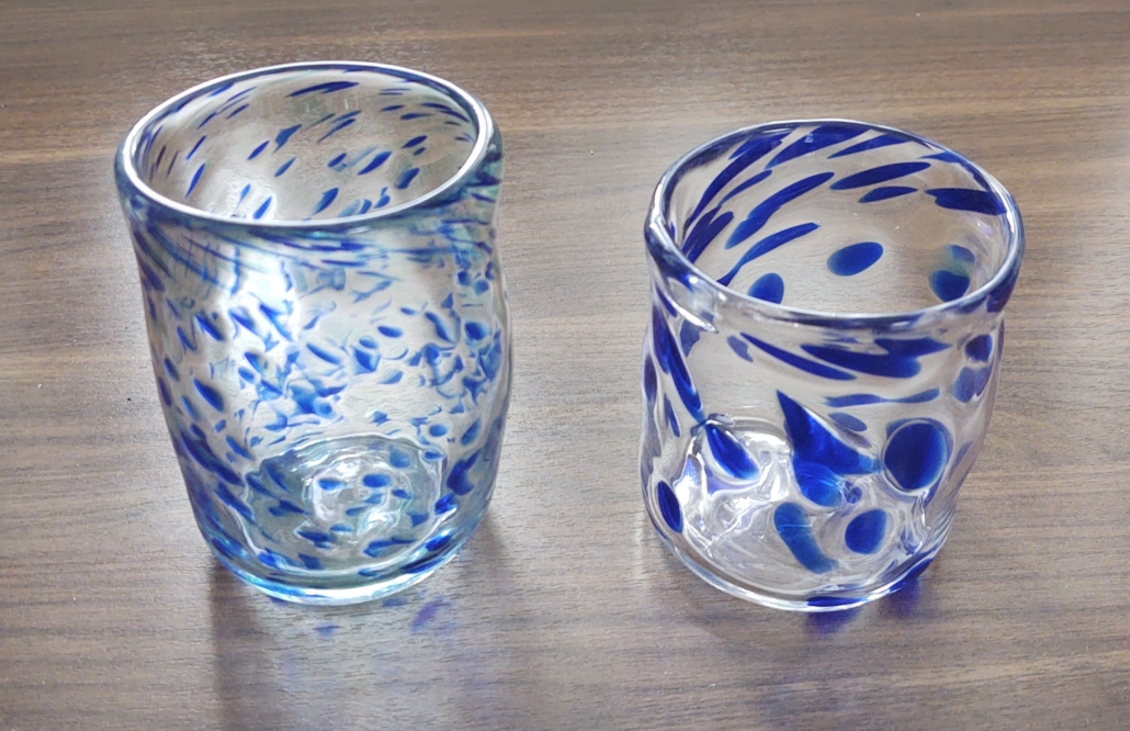 We got to choose coloured glass pieces to add to our glass to make it unique – both of us opting for the same blue to match our pottery bowls. Jay went first, skillfully being directed by Jonathan. There were many steps including rolling the molten glass in the coloured chips, reheating it, moulding it with his hands (protected only by a wet yellow pages), blowing the glass into a shape and using tools to form the opening.