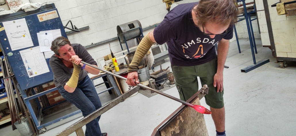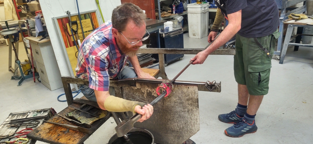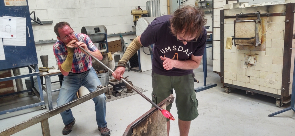 Jonathan welcomed us to Lumsdale Glass where we were happy to gather around the huge glowing furnaces as the weather had turned and it was raining and cold outside. We were talked through a few safety points – we would be handling molten glass and hot metal poles – before Jonathan made it look really easy demonstrating what we’d get to do.