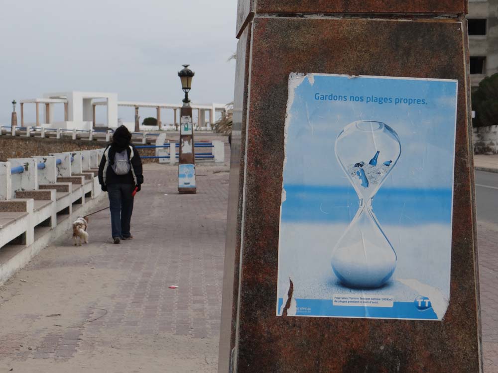 The poster is advertising Tunisia Telecom. It, along with about hundred like it, are glued to blocky posts along the sea front. They say you should keep the beach clean, and glowingly tell you TT cleaned up a load of beach, once. No-one seems to have spotted the irony in the fact they glued a load of posters up, which no-one can get off.