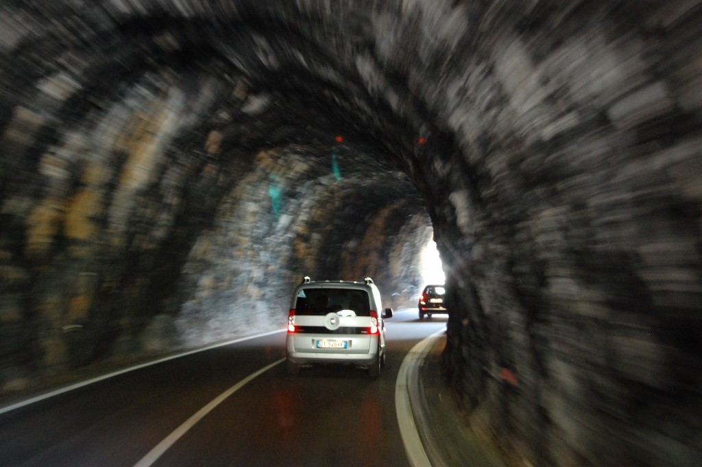 The second tunnel was not much bigger, but it had lights on in it – phew. The third bigger still with a white line down the middle – things were getting better. By the time we reached the North of the lake, the tunnels had road junctions in them, something I don’t think I’ve seen before.