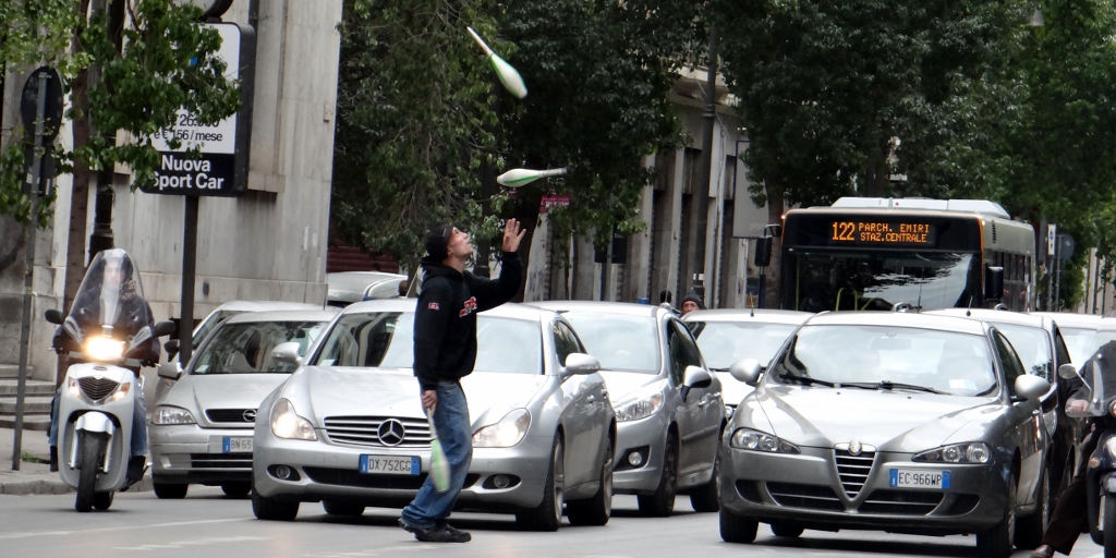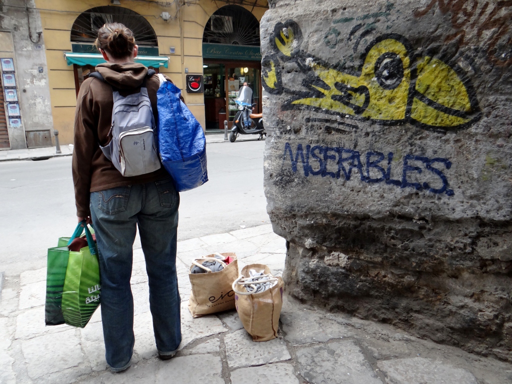 This morning Charlie and I headed off into downtown Palermo to find a laundry. Now we’re back in Europe we need to wash some clothes so there is room in our drinks/laundry cupboard for when we reach Lidl. Only problem is that self-service laundries aren’t easy to come by in Sicily. We’d heard there was one about a mile from where we are parked, so rather than dragging all the laundry over there only to be disappointed, Charlie’s pooch walk doubled as a reckie to see if it really did exist.
