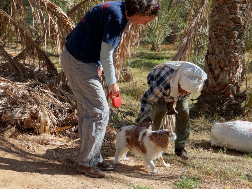 We kept our eyes on the pack of wild dogs roaming around, while Charlie kept his nose to the ground snuffling up as many dates as he could find. The men working among the palm trees smiled and greeted us, asking how we were in French and occasionally calling us over so they could give Charlie a stroke.