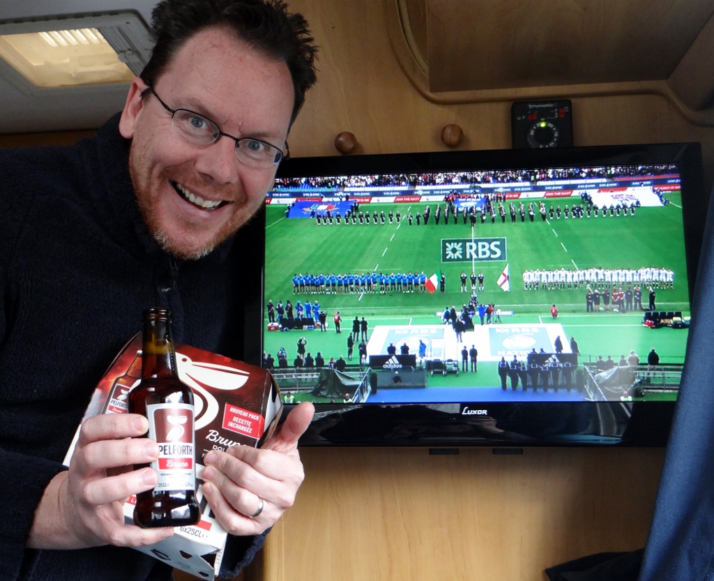 I headed across the train tracks to the nearby petit Casino (corner shop) for a baguette and came back with some Saint Valentine’s day treats; a bit of steak for tea and some nice beers for Jay. As I wandered back I noticed all the other vans in the car park had their satellite dishes up. Hang on a minute! We have electric hook-up, which means we can have the telly on! We’d not thought about it last night, opting to watch a film on the laptop instead. Up went the dish and the rest of the day has been very lazy watching Sunday Brunch and the Rugby, as the mountains around us remained shrouded in cloud and rain showers swept across us. It was great to see England do so well, sports events like that are the reason we’ve bothered to keep the telly in the van after we missed out on the London Olympics because we were on the road.