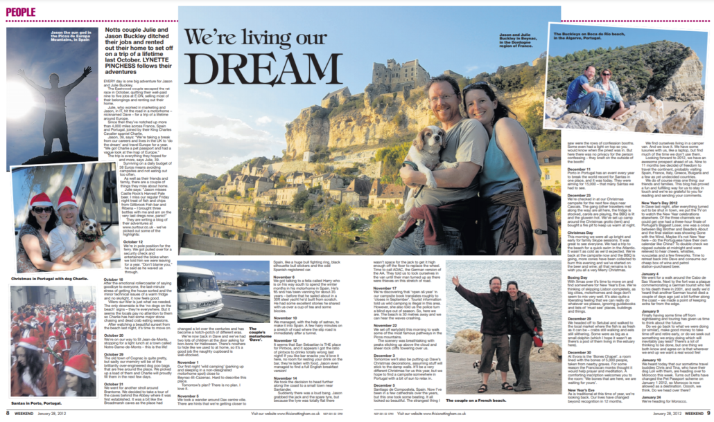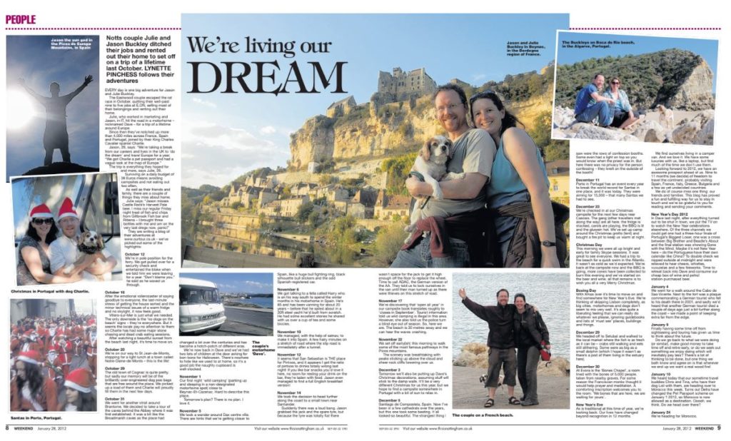 Lynette (fellow camper-vanner) at the Nottingham Evening Post (the newspaper for the city we live in at home) very kindly put together an article for us. We loved it, as did our families and friends. There’s a copy of it below, or you can download it here.