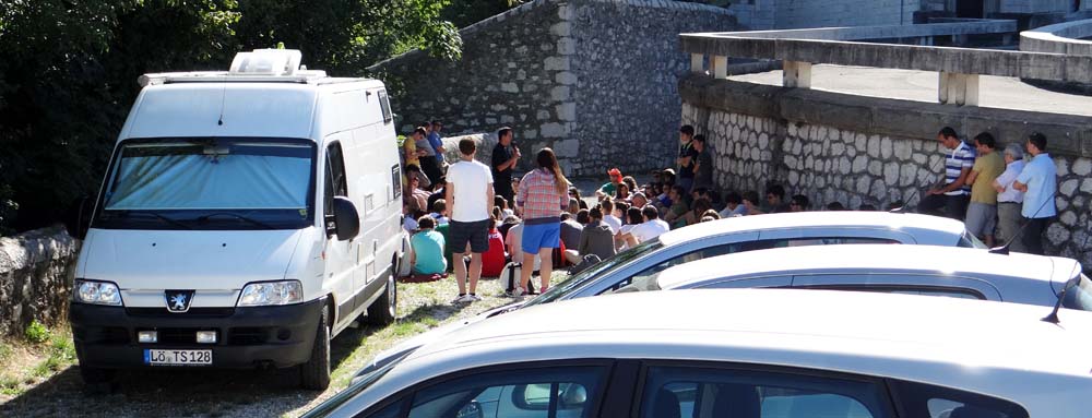Peering out of Dave’s curtains I wasn’t surprised to see the car park was full – after all we were parked in the cathedral car park on a Sunday morning. It soon became apparent that we were blocked in by two Italian coaches, but we’d got off lightly, the German motorhome in the corner of the car park had a bloke with a PA system giving a lecture or sermon to a crowd around their van.