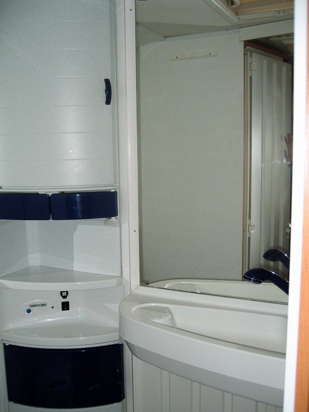 - Sanitary facilities: wet room with internal hidden wall to separate shower and toilet. Shower heated from gas. Cassette chemical toilet emptied from outside