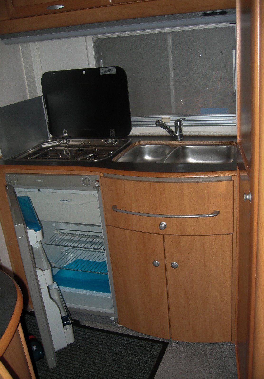 - Food storage: 3 way fridge (12V when driving, 230v when on hook-up and gas otherwise), full width freezer within fridge unit