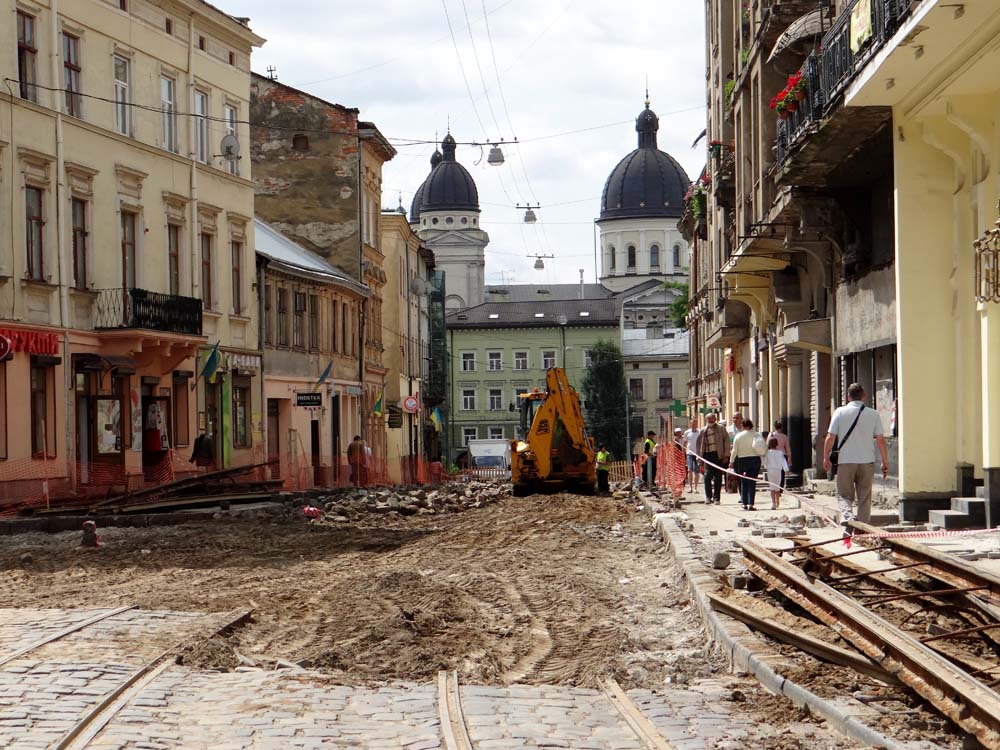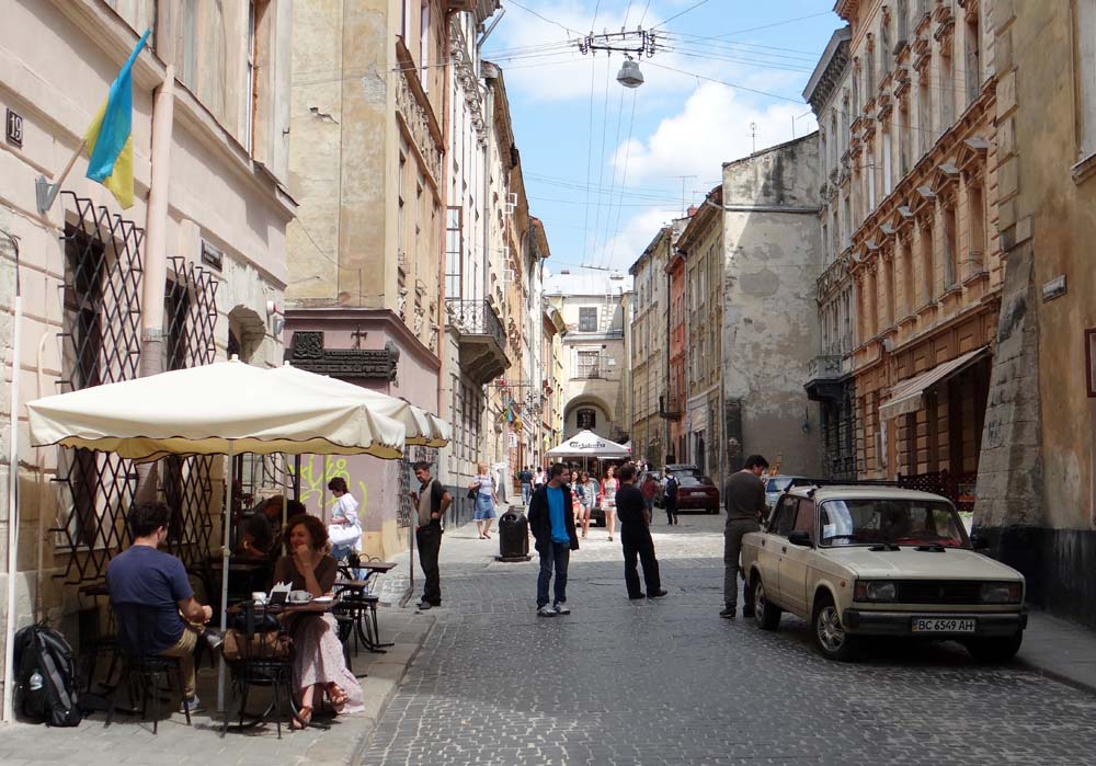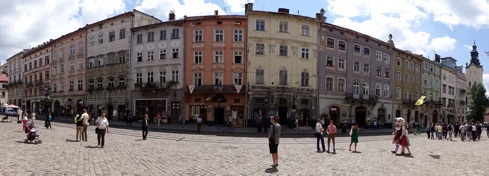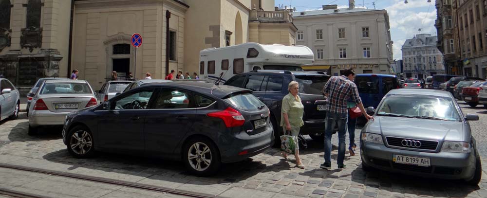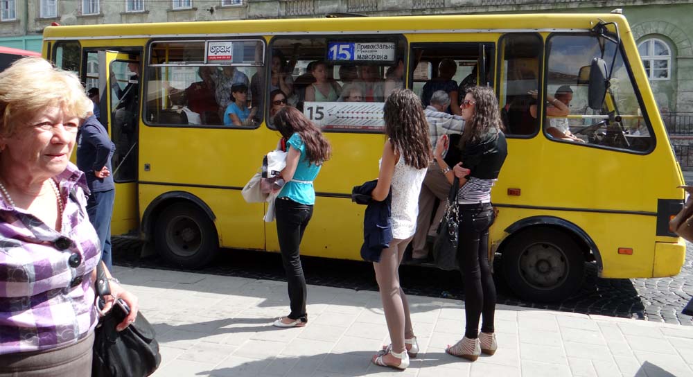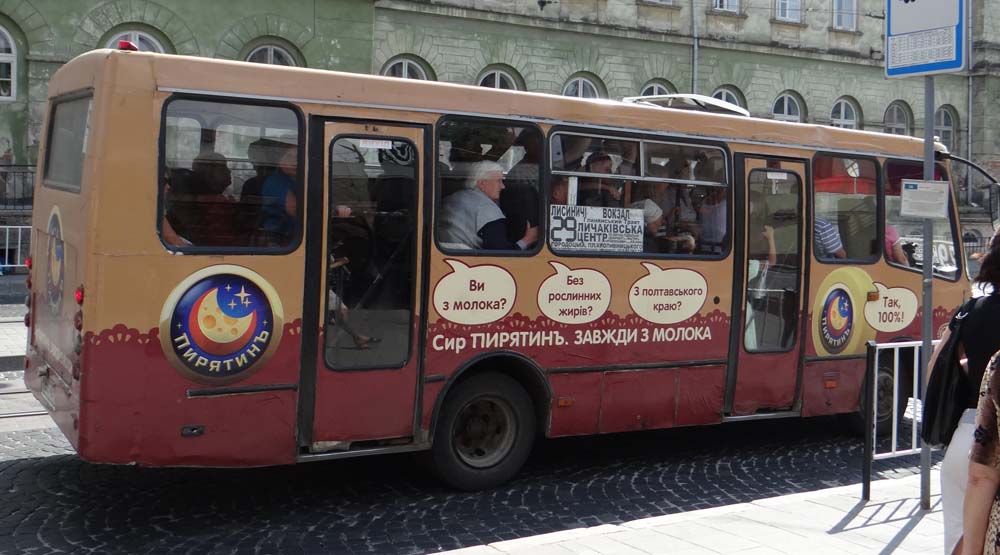 We left them heading for the Polish border, having visited Lviv yesterday, and we walked over to the bus stop. Pointing to Charlie the driver nodded an OK and we got on, we’d seen others get on and hand over something to the driver so we knew it wasn’t free like we had thought, but at 2 Hr each (less than 20p) it wasn’t going to break the bank – and Charlie was free. The bus set off and then almost immediately pulled in outside the racecourse, less than 100m from Dave, so if you do come this way no need to brave the dual-carriageway crossing to catch it! The bus itself was very posh compared to all the packed full, ageing, short, yellow buses running around it, and reminded me of the Rainbow 1 buses we used to catch at home to go into town. Soon enough our bus was also packed like a sardine tin and we were glad we had seats as it cleared the concrete tower blocks and reached the bumpy cobbles of the town centre.
