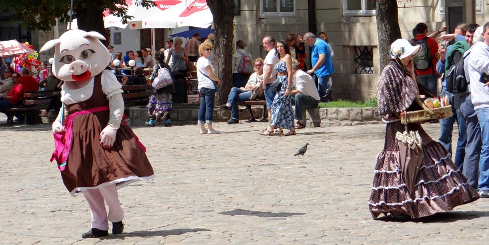 Passing through Rynok Square things turned a little too touristy, if you can have such a thing. The little train was sat by the town hall waiting for passengers, girls wandered around dressed in large dresses and bonnets selling sweets from shoulder trays, people tried to press white doves into your hands for you to have your photo taken with (or for Charlie’s lunch!) and a pink pig walked around waving at folks!