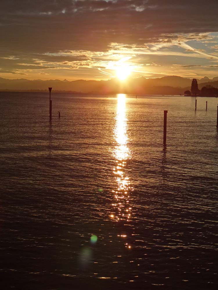 Something called out to me this morning, probably yet another all-night-bonging Church bell, and a body-floppy-reluctant Charlie and I leapt from Dave to catch the sunrise over Lake Constance. The air’s warm at the moment, even at the early hour of 8am. Charlie made a repeat attempt to conquer the lapping waters through barking, perhaps taking advantage of the good weather to launch his repeated assaults. We read the wide waters can propel towering waves at the shore when a storm hits. Fishermen were also out in force, an armada of small boats anchored off shore, each with a single reclusive figure tugging at lines as birds swooped and floated.