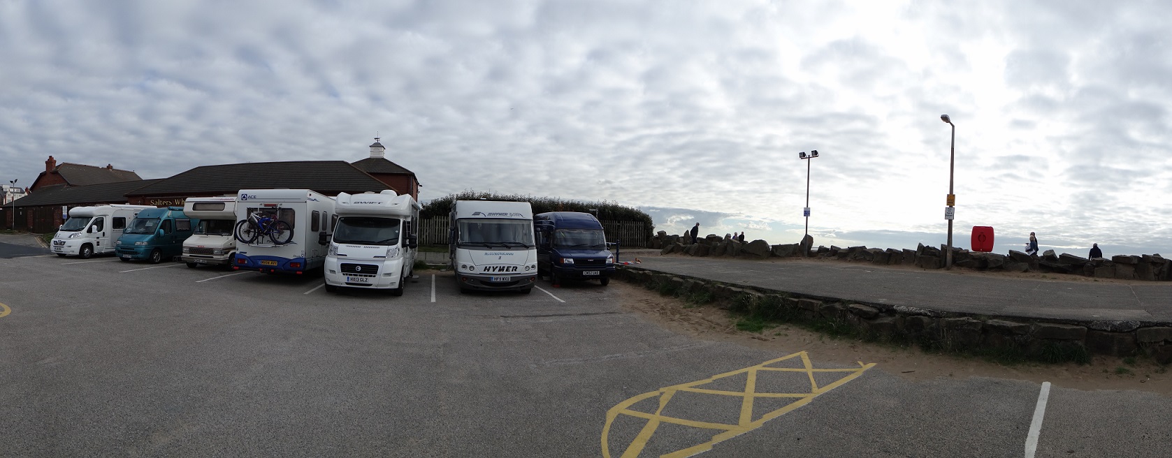 What’s this? An authorised motorhome aire? In the UK? On the coast? Right up against the sea? Yup. We’re at Lytham St Anne’s (N53.75371 W3.03903) and the cuddly council has had the foresight to allow motorhome parking here. It’s 6pm on Friday night and there are about 12 vans slotted in around us, of various shapes and sizes. The sands stretch out to my right for miles before finally hitting a strip of silvery Atlantic and I’m in my shorts and crocs (well, croc ripoffs). Sadly there’s no borne/service point, but maybe soon?