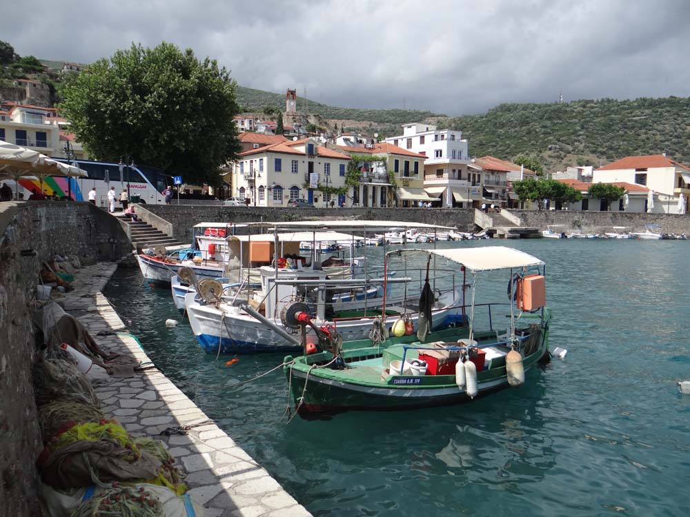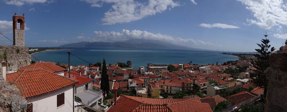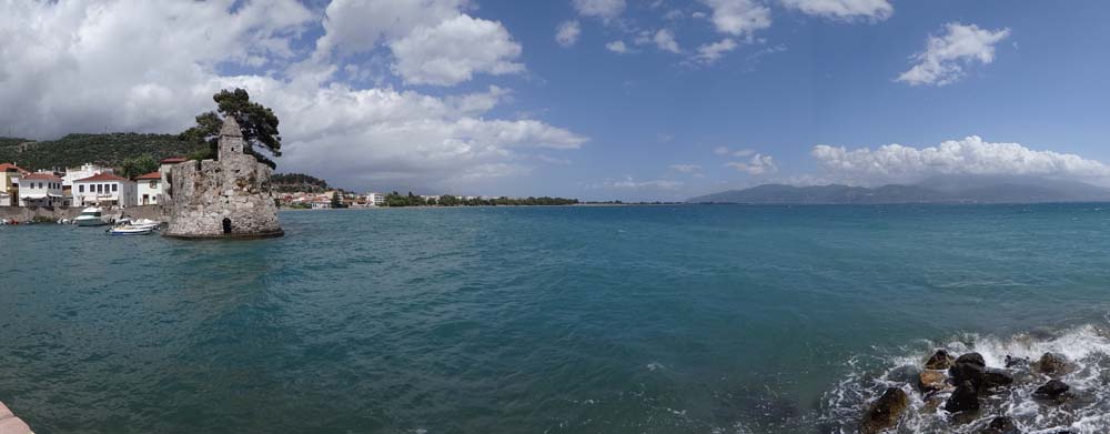 Dave the motorhome was battered by the rain last night at the sea-front parking spot a few minutes walk from Nafpaktos (N38.38718 E21.82095). The shell of the van amplifies the hammering rain, sleep’s impossible even with ear plugs, so we slept in this morning instead. We waited for the rain to clear, wrote an article about making money travel blogging, and only headed into town in the afternoon. Given the fact we’re a bit bleary-eyed, and need to time our run into Athens to avoid locked museum day (Monday), we’ve decided to take it easy (imagine that) and stay here another night. A Dutch and British van have arrived during the day and parked behind us; it’s good to have some company.