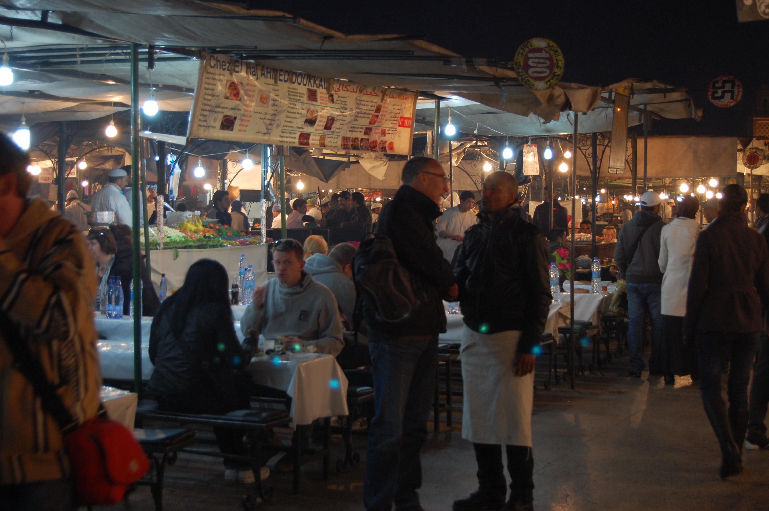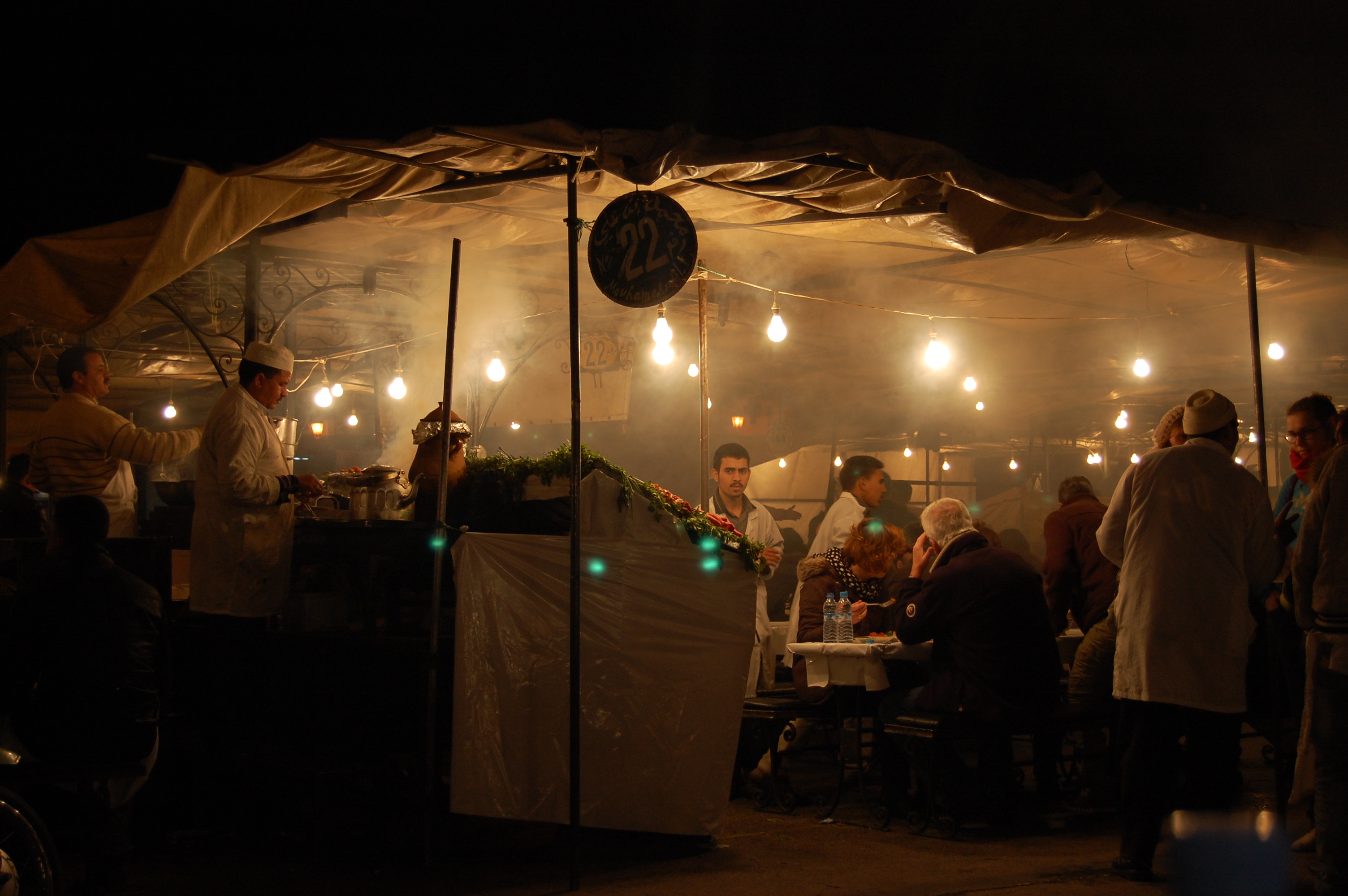 - Djemaa el Fna. We’ve no idea what the faint green lights in the sky are?