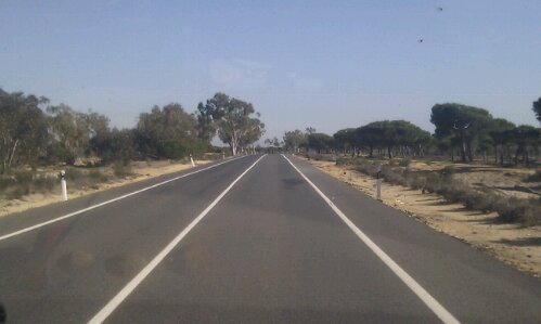 Tonight’s kipping spot is practically against the fence of the Parque National de Donana. It looks like a great sand dune wilderness. A couple of signs at the gate state ‘no pets’ and ‘don’t touch these’ with silhouettes of wasps, snakes and scorpions. No fear. A tiny booth at the entrance was amazingly occupied by what must have been the most bored person on the planet. She must have been ecstatic to have spotted Charlie. She leapt up to repel the beast, but we’d already turned away, scared off by the signs.