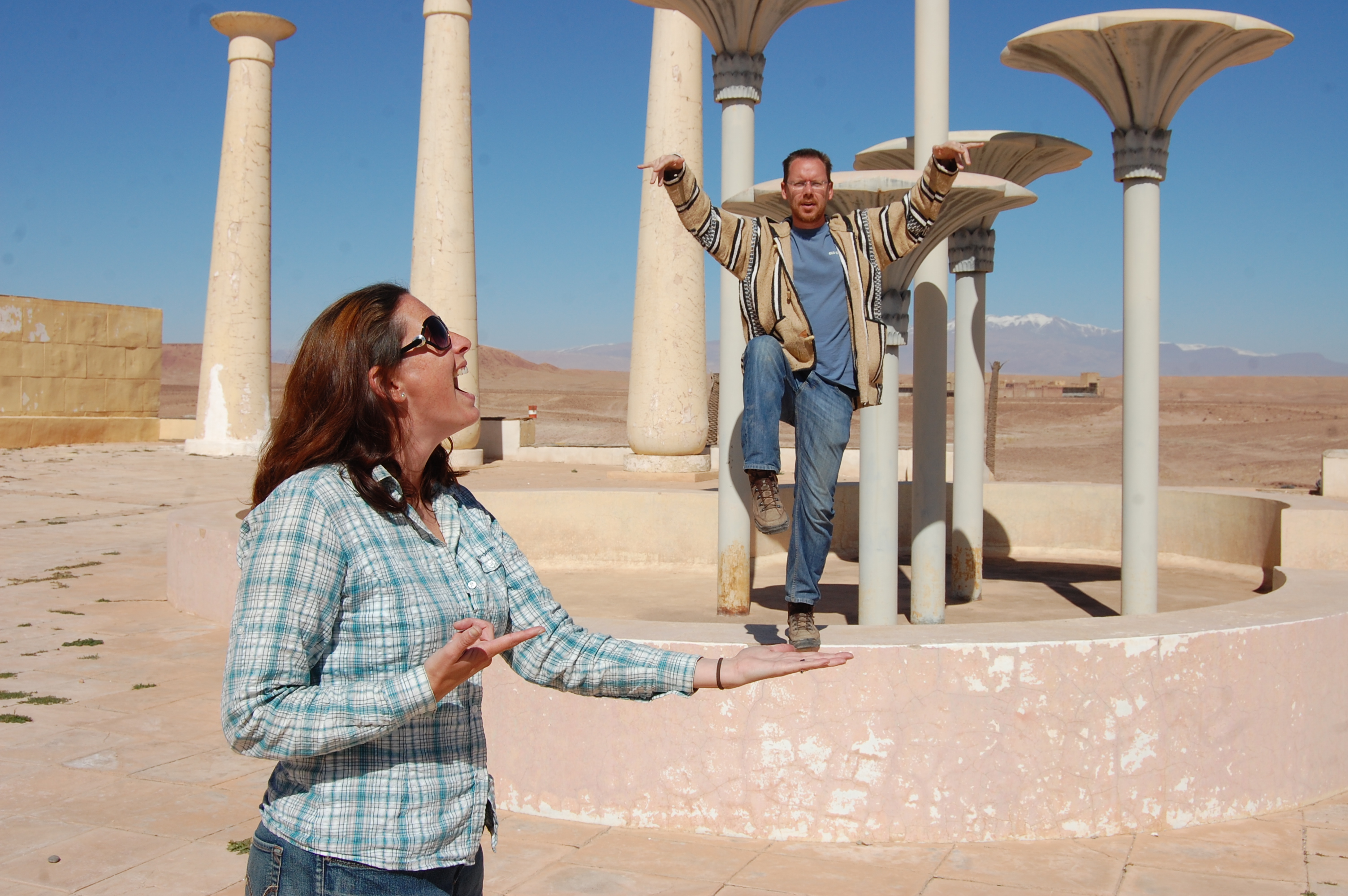 After an hour or so in the film studio (50Dh, including guide – about £4.50 each), we headed north for an hour or so to Ait Benhaddou kasbah. It’s a rambling collection of fortified mud buildings, with a few families still living in them (one woman tried to get us into her house – we politely declined, anticipating the small fee involved). Lots of the buildings look new; perhaps down to the various modifications made by Hollywood for the films shot here. Gladiator featured again, with the ‘training ampitheatre’ being positioned at the bottom of the town in a natural hollow. Sadly only the hollow remains, the wooden seats and coverings having been removed to make way for later films. We walked straight past it (having fended off loads of faux guides in the way in) but our Welsh acquaintances had been shown where it is, so we walked back to it and I once again clowned about.