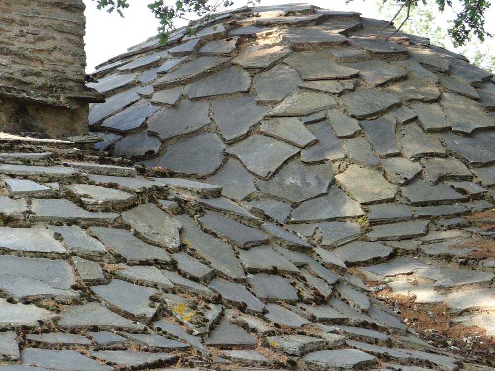 This morning we woke to fresh cool air, beneath our corner of oak-shaded mountain. Being at the end of the road, almost, there’d been no traffic to keep us awake, no noise at all in fact. The stars had pulled off the trick of becoming more infinite, just by staring at them. Next to us the church drew our eyes again, to the scaly, organic roof fashioned from thick slabs of slate set on wide bubbles as though someone had blown the place from glass.