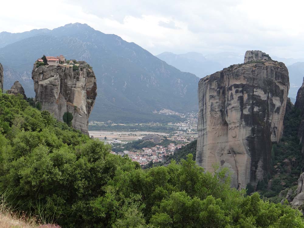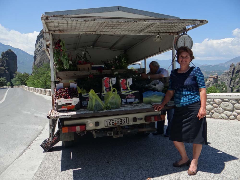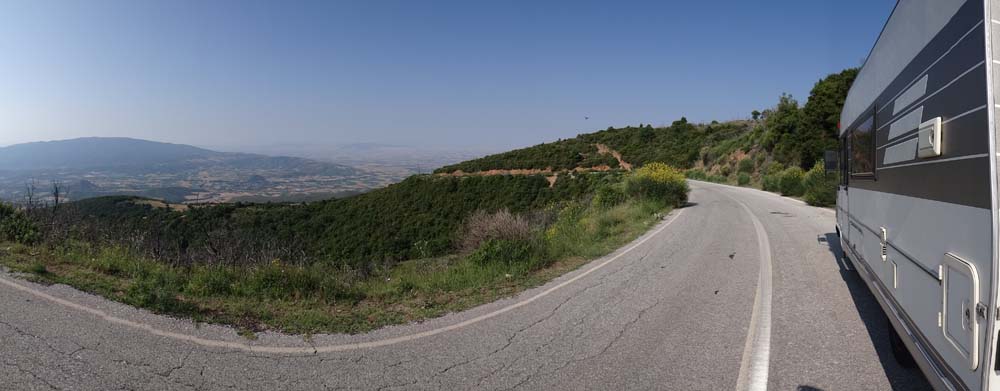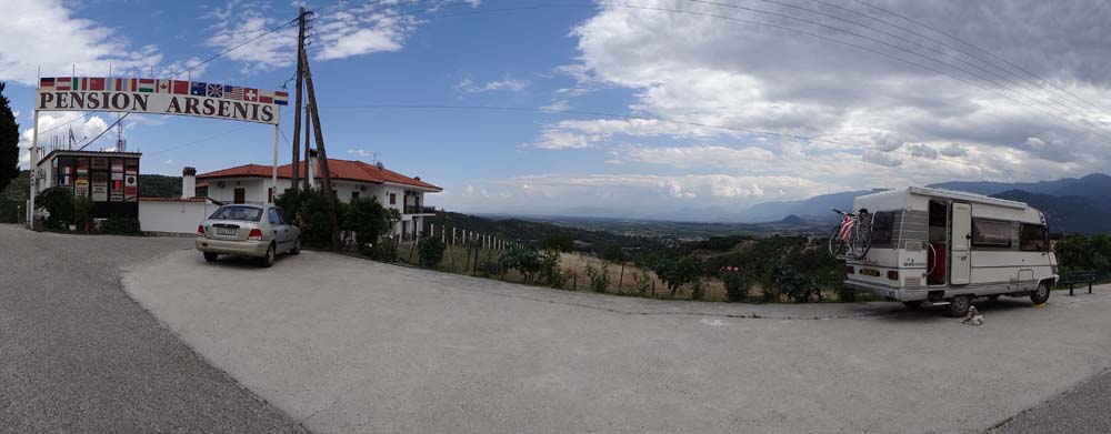 Dave the motorhome has a magnificent view out over the Thessalian Plain, which brought us here, from his slightly wonky but free of charge parking spot at Hotel Arsenis (N39.70857 E21.65424). There is, of course, the expectation that’ll you return the hospitality with the purchase of a meal, and we’re happily off for BBQ chicken later on (‘you want chicken, or pork’? asked the owner as he buzzed by on his moped). At the moment there’s just us and a friendly German couple here, maybe more folks will arrive later. The hotel’s sat up on the hillside out of town, just a couple of km from the nearest of the monasteries here.