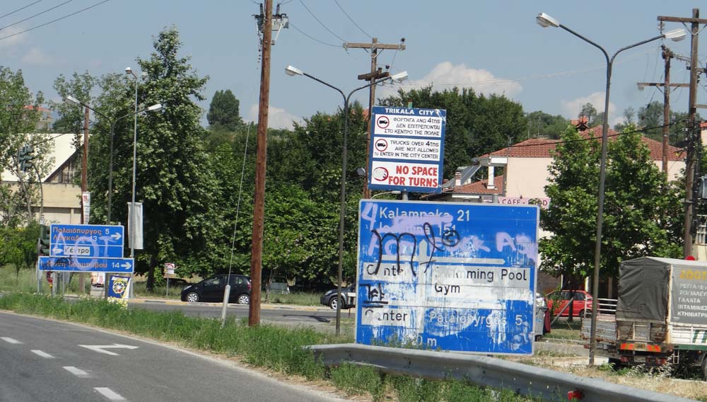 While researching this part of Greece, Thessaly, west of Volos, I could find few references to the place. Guidebooks had little to say and our databases of places to stop were empty. On entering it, I could see why, it’s like a miniature version of the US Great Plains, an effect amplified by the growing heat. Unless you’re interested in combine harvesters, huge devices for spreading water over the parched earth, or have a desire to spray paint your favourite Ultras football team logo on every flat surface, it’s perhaps not for you. The towns were all tired, shabby working places, unappealing, maybe even a bit depressing. A one legged chap at the lights opposite us hopped about in cut off jeans, half-heartedly proffering his polystyrene cup at the few cars which were forced to halt alongside him. When there we no cars, he hopped back to the front and stood with his head in his hands. He summed up the plain for me.