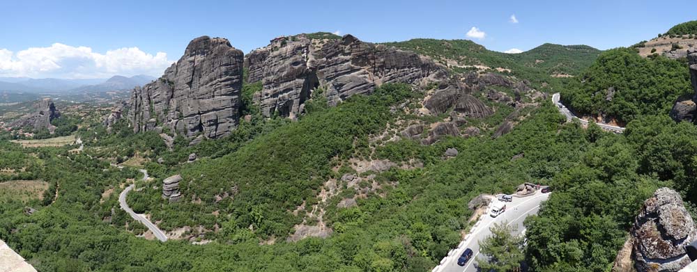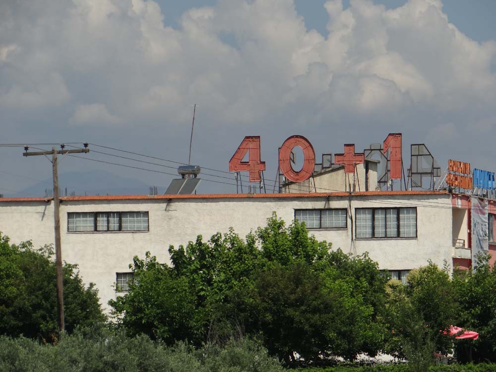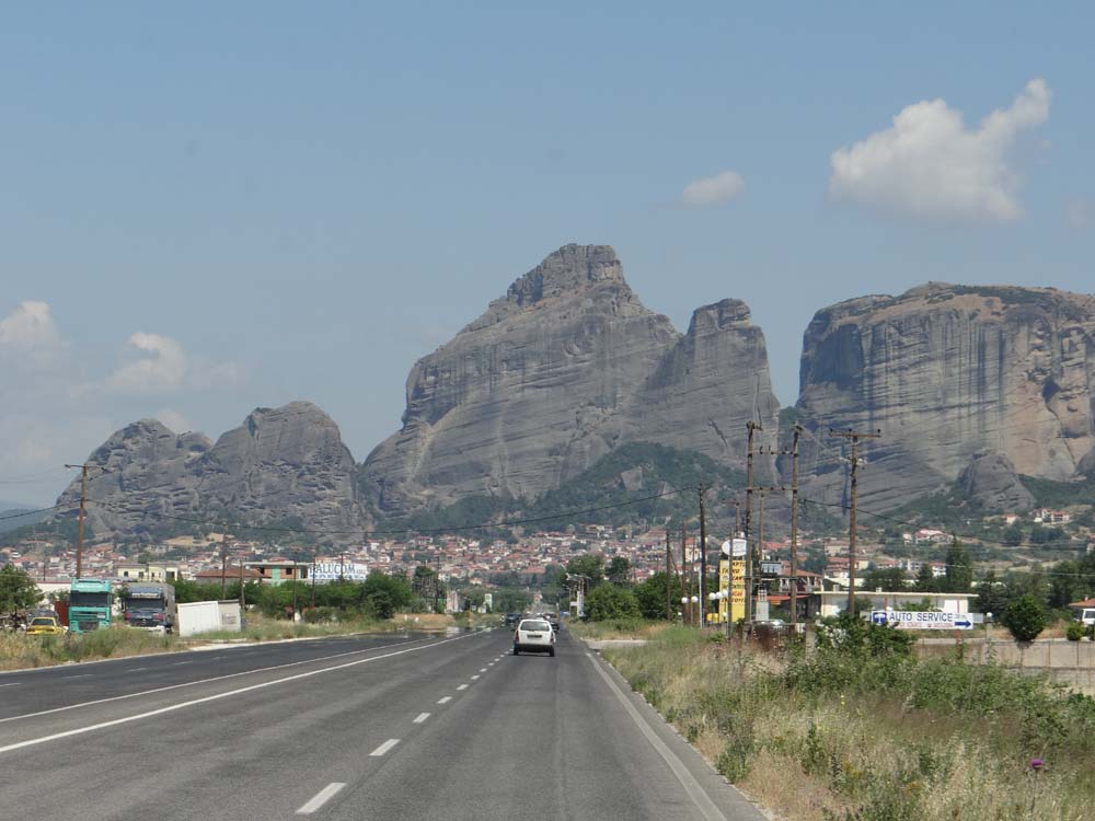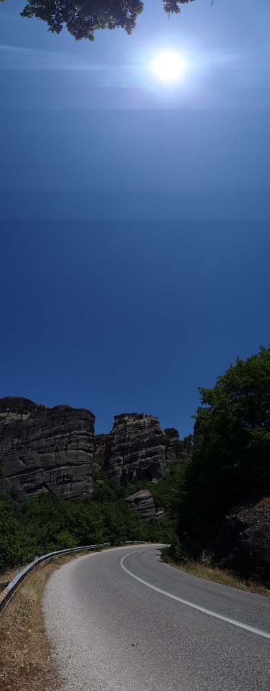 After a couple of hours we caught the sight in the above photo, the vertical rocks around the foothills to the Pindos. You beauty! A few minutes later the road slowed and entered Kalambaka. Another victim of being caught between the German war machine and local resistance fighters, the town was torched. These days it’s an uninviting collection of hotels, some of them dialling up the kitsch factor to full, faux marble columns and copies of Greek sculptures stood uninviting outside. Ju’d got a handle on where we were using a map someone kindly gave to us a while back, sadly I’ve forgotten who but of you read this, thanks! Into the town the slow march of a lone black-clad priest halted us as a hearse and progression of morners passed us. At the next roundabout (does anyone know the law for roundabouts in Greece? – it seems to change on a per-roundabout basis) a crane blocked the exit we needed. Taking a tour back around the town we ended up back at the same spot, and went local, driving up the entrance side of the exit with the help of a nervous-looking young fella in a high vis jacket. Kalambaka: done.