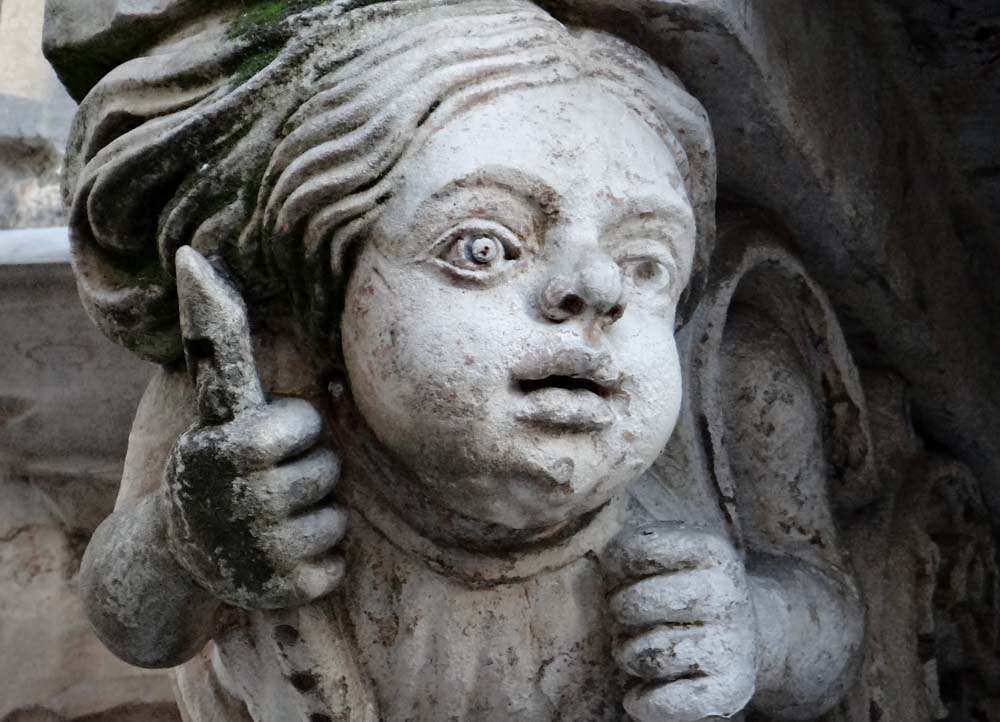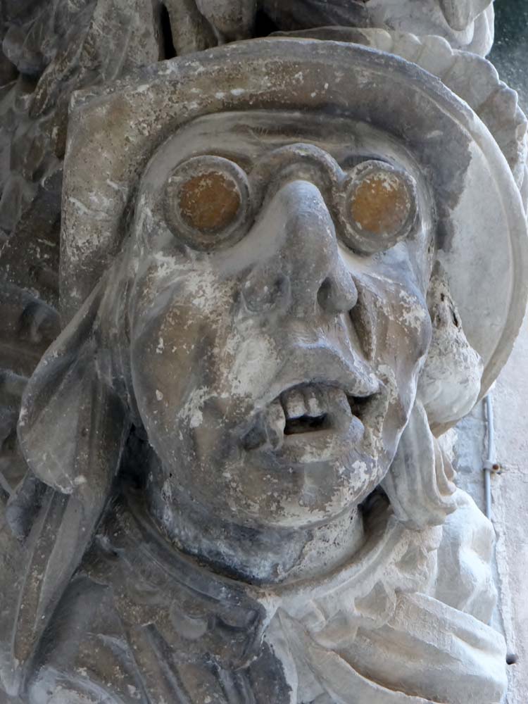 Another tourist info office located, this time with a buzzer to gain entry, and we had another map with a highlighted walk drawn out, plus leaflets with page after page description of portals, columns, vestments, sacred texts and yawn. This time we stuck to the path, toddling along staring at playful sculptured façades and dodging cars. The upper town seemed to merge slowly into the lower one, its straight-laced street slowly becoming malleable until it twisted like a piece of hot Blackpool Rock being bent into some edible shape or other.