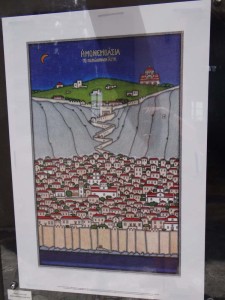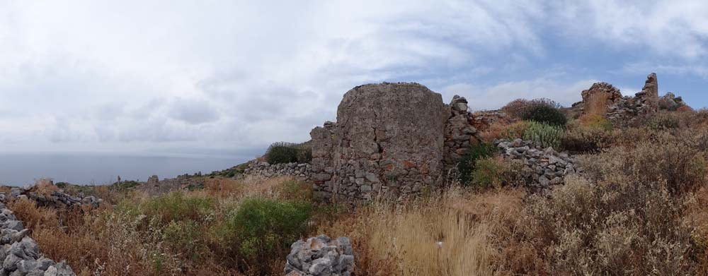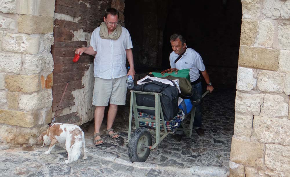 Over the course of nearly 1500 years of history, various empires have had hold of the place, and if you’ve a better eye for architecture than me you may be able to sniff out the conflicting styles. The upper town is all but rubble now, a single restored church and water cistern stand in one piece, the rest’s given over to vine-like thistles, wild flowers, legions of fat ants and infeasibly hairy spiders. The lower town’s clearly been restored, and looks magnificent for it. From above the rust-red roofs cast about like shuffled cards. Among them there are a few remaining piles of grey rubble awaiting the masons. We’re told donkeys shift the building materials about in the road-less town but we saw none, just a bloke with a barrow full of luggage.