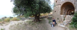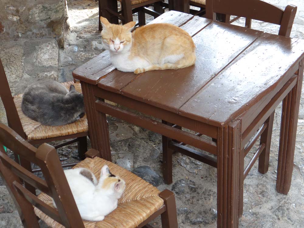 Inside we met a couple from Vancouver, who were on the Harmony V, the flash boat we’d seen earlier. They were living in Lyon for a couple of years and were sharing the boat with only 28 other passengers, on a tour of Greece which included talks on history and art as they went. We’d spotted other passengers being given a tour of the town, and had sneakily had a listen in to him telling how the owners of outdoor drinking and eating areas hadn’t until recently been allowed to cover the area, instead giving their guests sombrero hats… An elderly chap from Athens got talking to us next to an olive tree in the upper town, a vest visible through his shirt in the 25 degrees temperature. He pronounced the tree to be a thousand years old, telling us other such trees on an island I forget are twice as old. A couple more passengers were from California, on an Alumni tour.