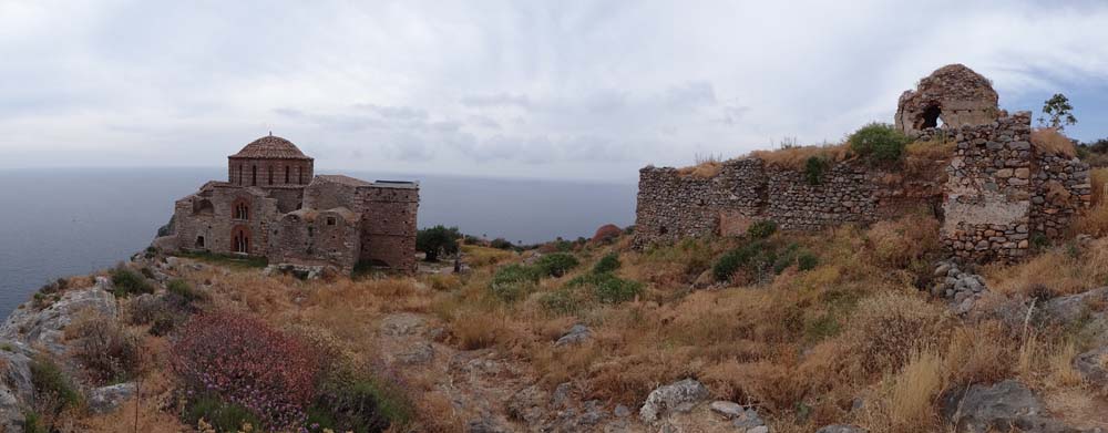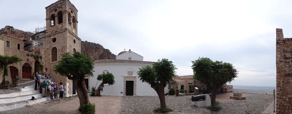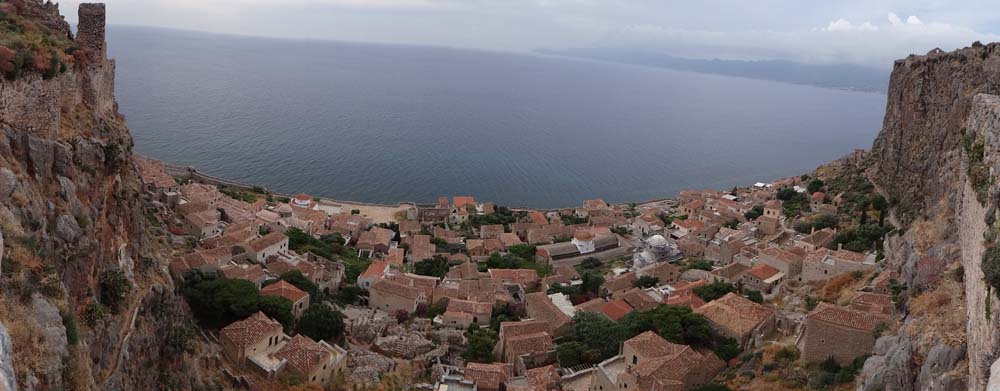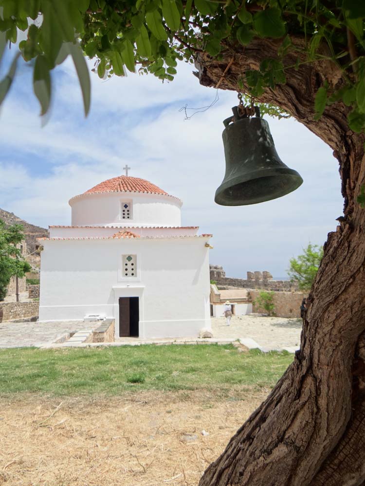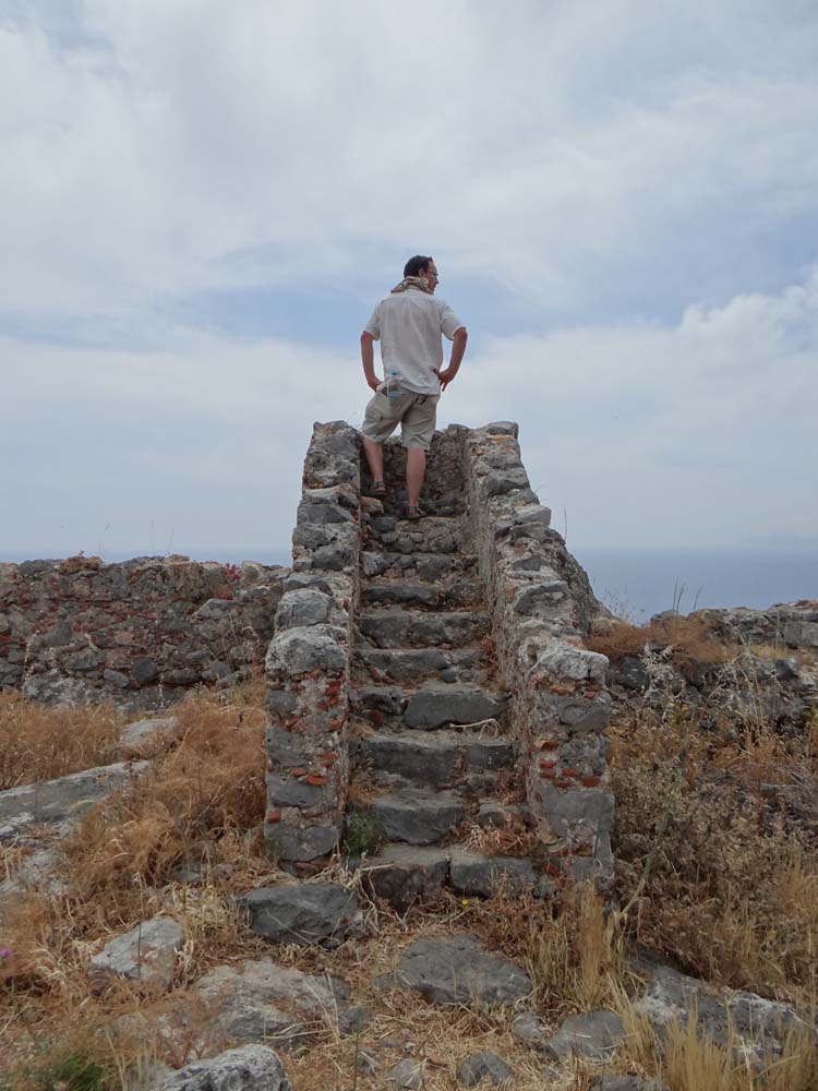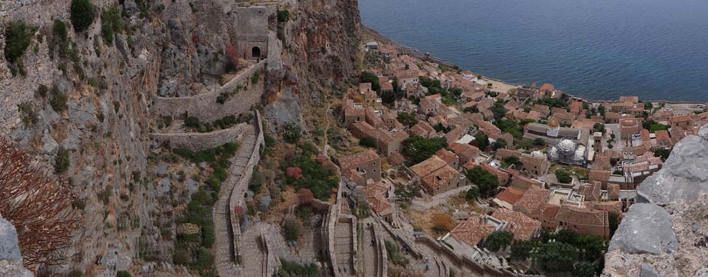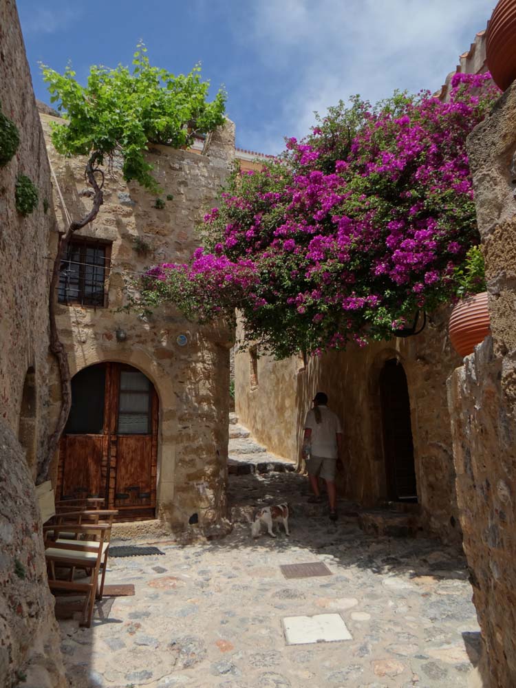 Monemvasia’s a kid’s castle of dreams. It’s impregnable, only ever fully conquered by starving the hapless inhabitants into submission. The ‘moat’ is the open ocean, lapping against a rough-footed giant’s tooth of rock, crossable on foot at one point. This causeway (where a load of New Zealand troops were evacuated in the face of advancing Axis troops in 1941) had a wooden removable section and a wall at one end with arrow-slits for fending off opportunist invaders (not much use against Panzer tanks I imagine!). Past this, you’ve about a mile of road which runs around the south of the island. Sounds easy enough but for the fact the by-now irritated inhabitants are likely lobbing rocks and smelly things down on you from above. Next job: get into the lower town. The swines have only gone and built a wall around it. Should you be bothered/have enough cannon fodder left to get through then congratulations, the lower town is yours. Huzzah. Only two jobs left: fight your way up zigzag steps cut into a 100m cliff face, through the gate at the top, through the upper town and tackle the hill-top citadel. You’d have to do all this on foot, maybe on horse-back if you’re crazy, as the tiny mesh of cobbled streets is too small for anything else. Nah, no-one got in by force, siege was the way in, one of which lasted a massive 3 years (by comparison, the unbreakable folks of Sarajevo lasted out for almost 4 years in the 90’s).