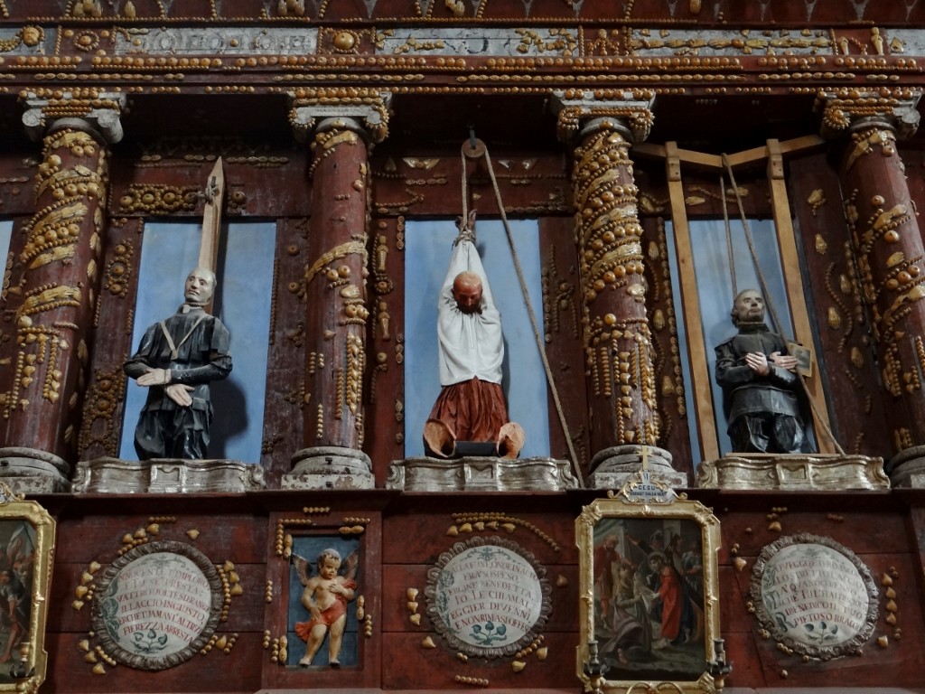 The reason for our detour to Grazie was to visit a church we had read about in our Rough Guide. Now neither of us are religious, but the description of this place had us intrigued. The church is full of mannequins in various poses and costumes and surrounding them are wooden hearts, hands, feet and even breasts nailed onto the pillars as votive offerings from recipients of miracle cures. The whole place was a bit surreal, especially compared with the gold encrusted, uber-blinged churches we normally look around.
