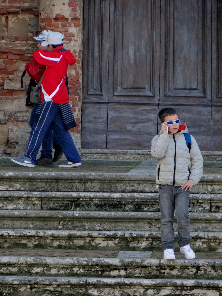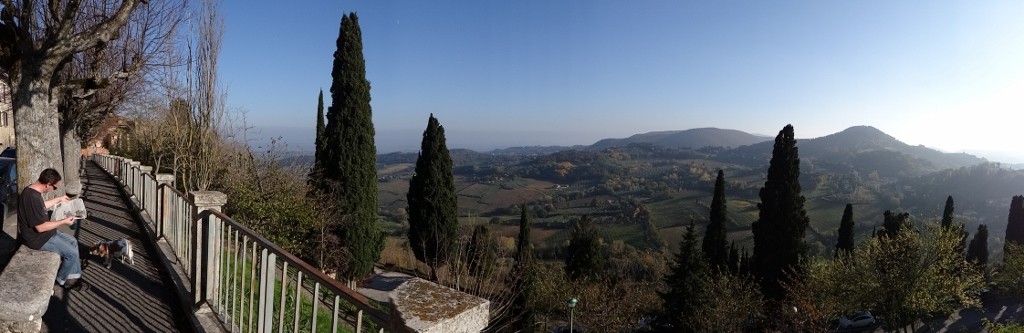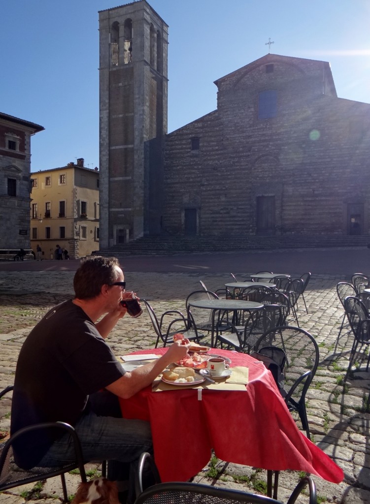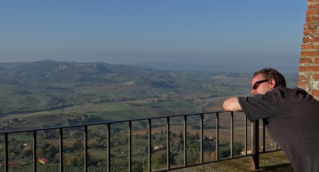 Slowly, like cats, the children were herded up and accompanied off the square, the bells fell silent (either that or I’d finally gone deaf) and peace was restored. We wandered around the town some more, taking in the views over the Tuscan countryside which were shrouded in mist yesterday.