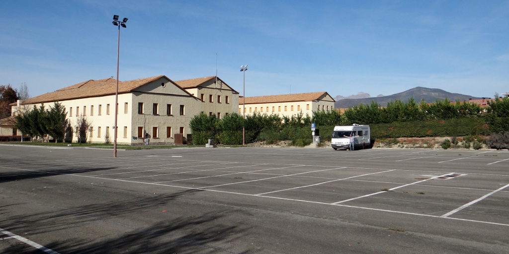 Satnav took us around the back of Sabinanigo past the industrial area to a large housing estate, minus the houses. The roads and roundabouts were all there but the homes didn’t look like they would be built any time soon. Following the co-ordintes for the aire brought us to a locked gate, pressing my face up against the metal I could see out of the corner of my eye an open gate on the side, which was in fact the front, of the Pirenium – a stopping off point for the Pyrenees.