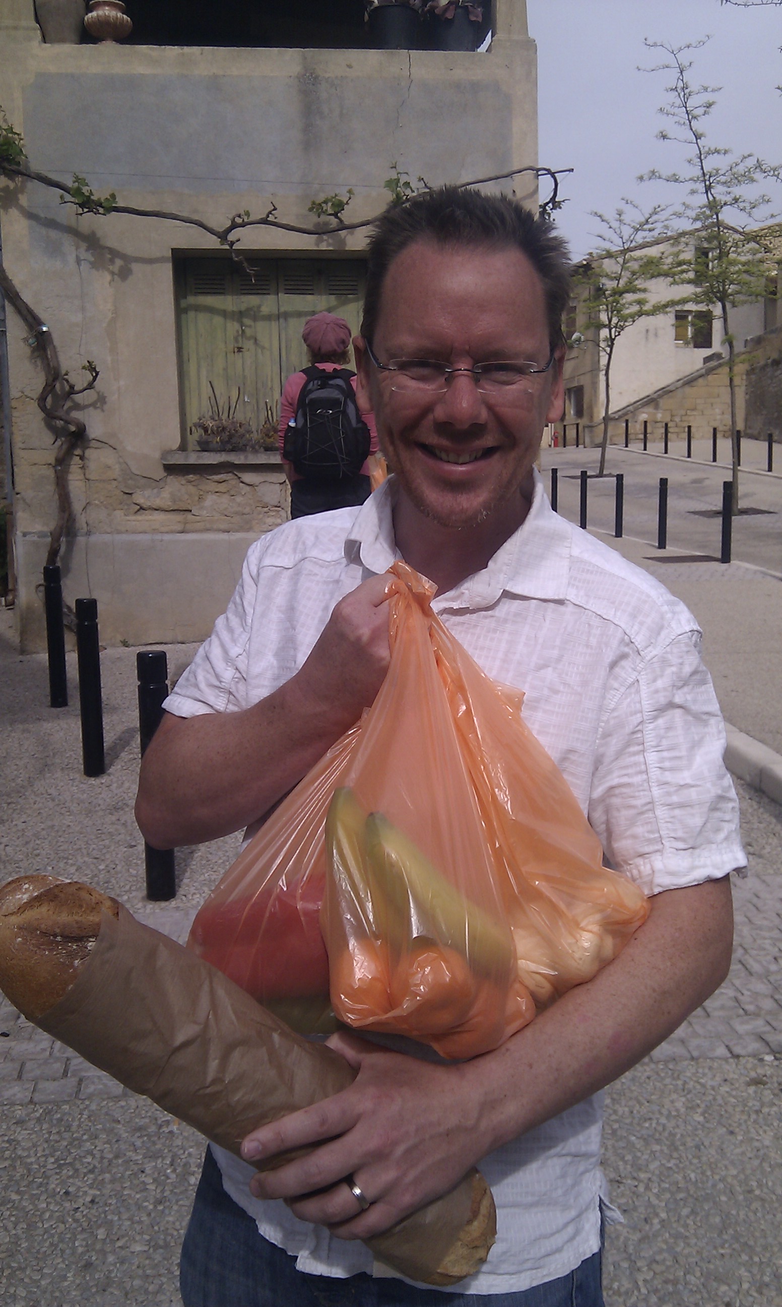 Phil discovered it was market day today in Remoulins, so after breakfast we headed over there and snapped up some fresh fruit, veg and bread. Jay was surprised just how much fresh stuff we got for our money, but then he’s usually not paying attention/lost the will to live by the time we’d reached the greengrocers section at the supermarket.